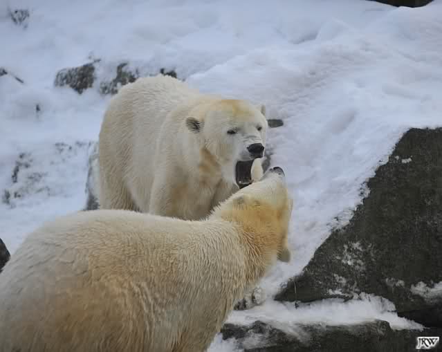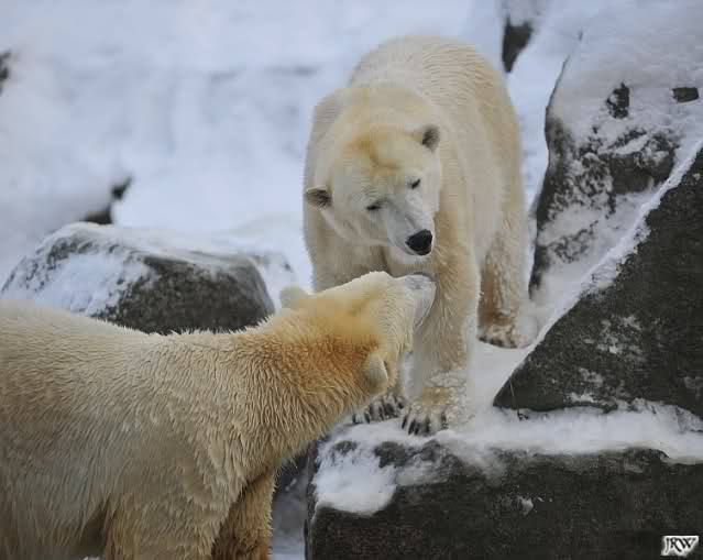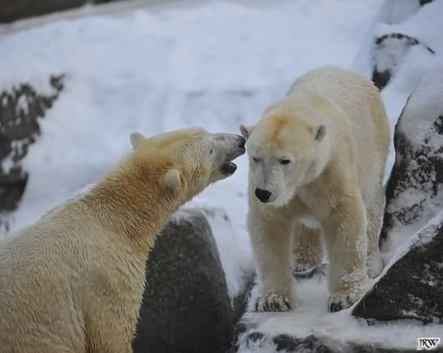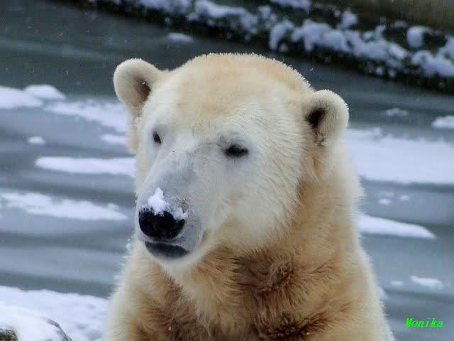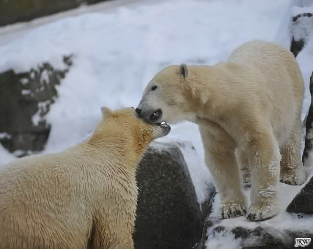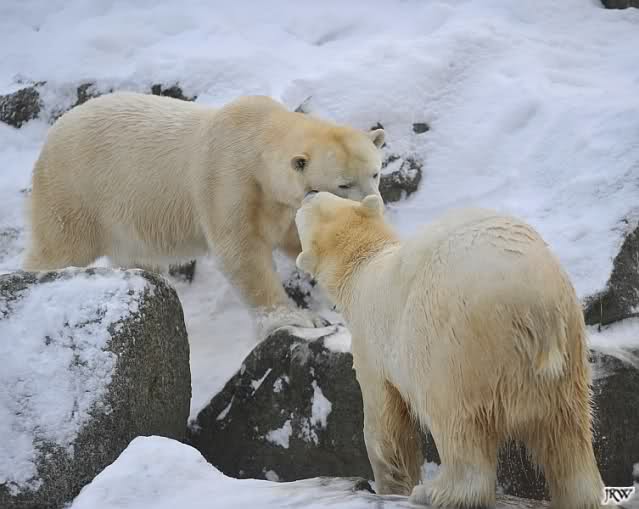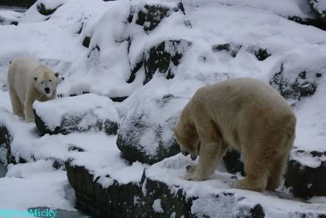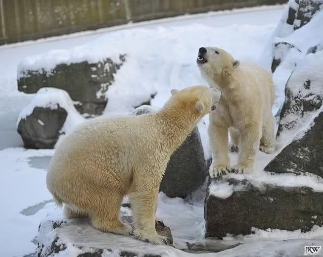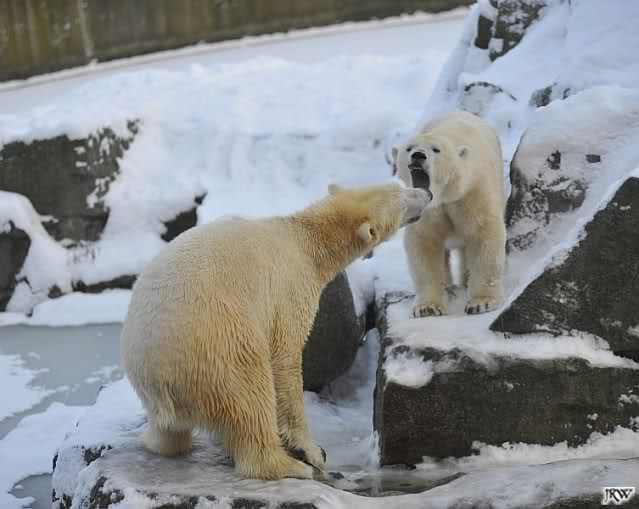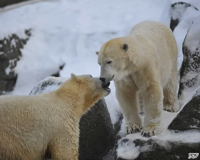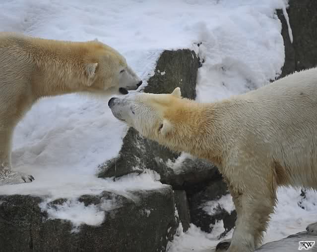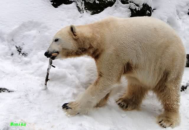 Für ein Weilchen war allgemeines Ruhen angesagt (ich meine nicht die Bärenfreunde sondern natürlich die Bären). Nachdem Monika schweren Herzens gegangen war, weil sie zu sehr schwitzte (ja, Ihr habt richtig gelesen), wurde es sooo schön. Tosca kam zu Knut und für lange Zeit spielten die Beiden miteinander. Der Schnauzenkontakt wollte garnicht aufhören. Wenn Tosca aufstand um fortzugehen, machte Knut Schritte auf sie zu. Wollte Knut gehen, streckte sich Tosca zu ihm und alles fing von vorn an. Hinterher bemerkte jemand, dass Tosca Knut nur bezirzt hat, damit sie an seinen auf dem Eis liegenden Stock herankam. Selbstverständlich nicht!! Sie fand ihn nach dem gemeinsamen Spiel nur interessant. Außerdem tat sie Knut einen Gefallen. Er hatte lange versucht den Stock zu bekommen, aber traute sich nicht auf das Eis. Tosca schwamm einfach hin und angelte den Stock, schob ihn unter die Eisdecke und holte ihn auch wieder hervor.