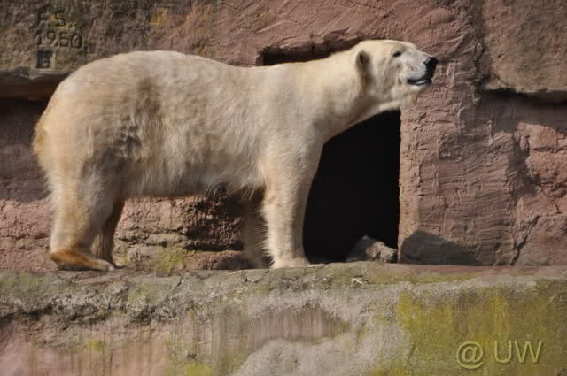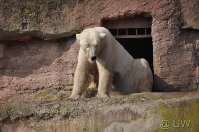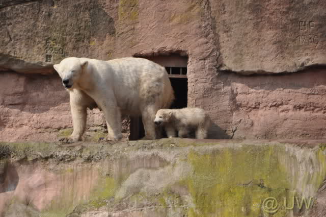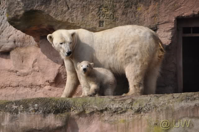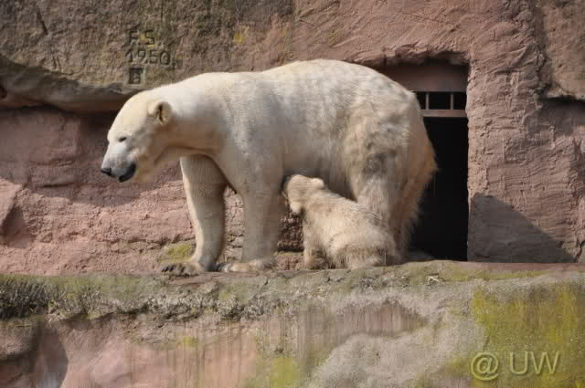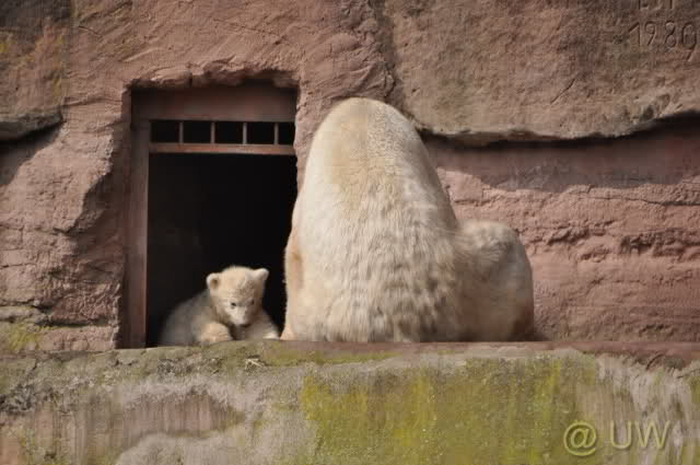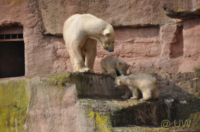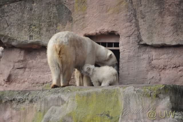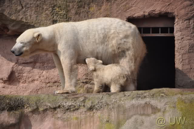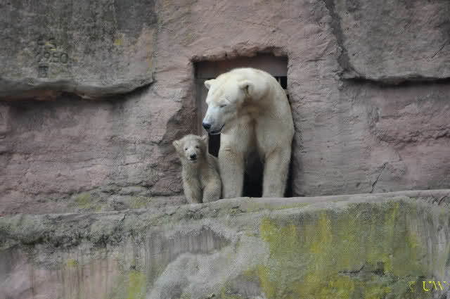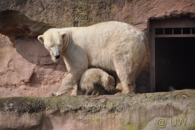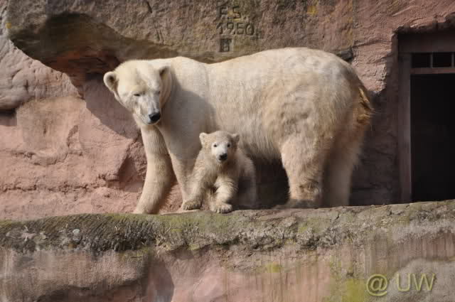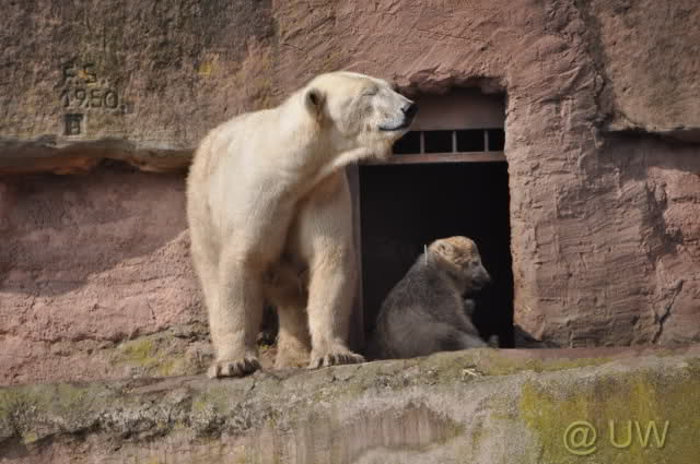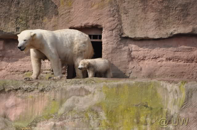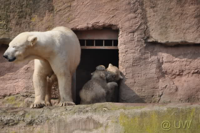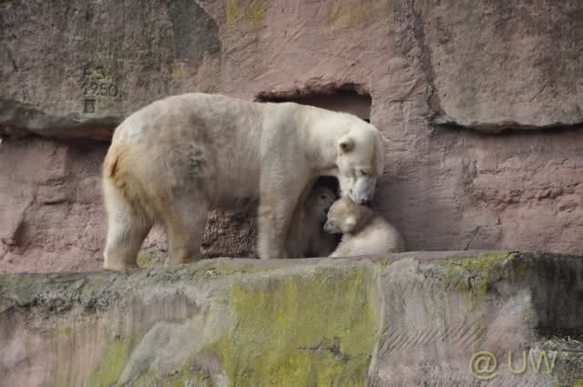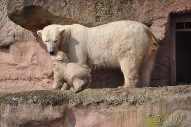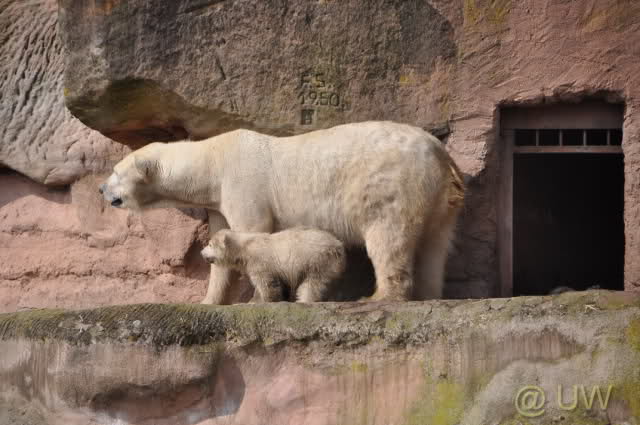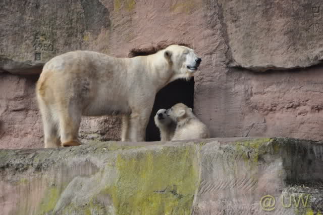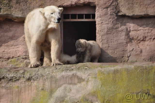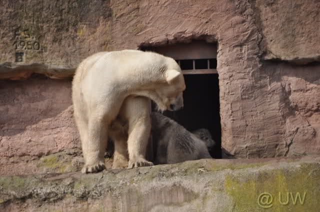 Um 14:30 Uhr gibt es jetzt wieder eine Eisbärfütterung. Obwohl Felix auf der Anlage war ist Vera mit ihren Kleinen heraus gekommen, allerdings auch hier erst nach einiger Zeit. Vorher war sie im Eingang zur Höhle gesessen und hat die Kleinen nicht heraus gelassen.