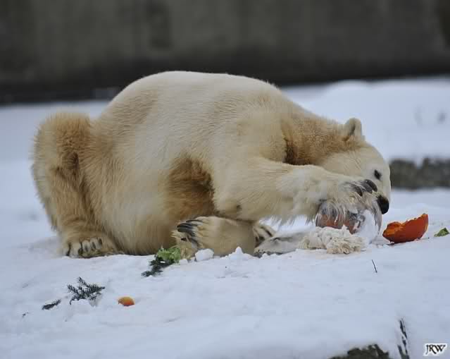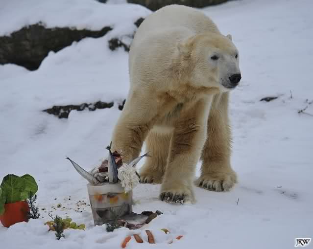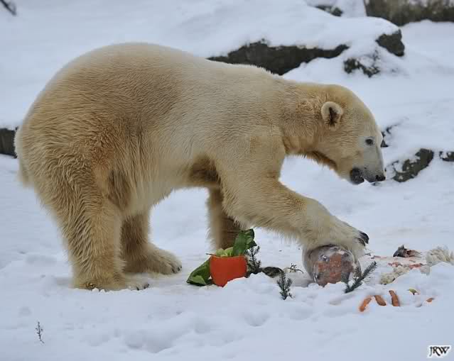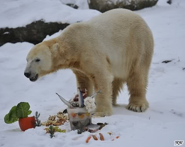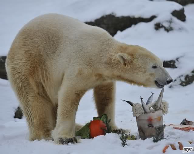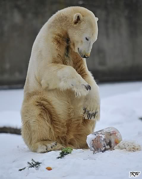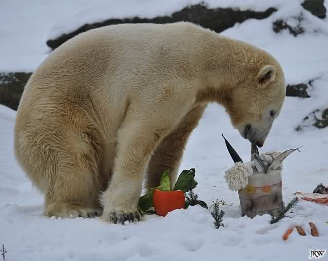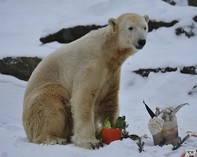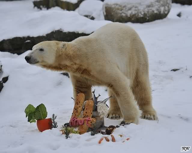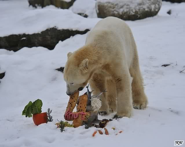 Für Knut war der Geburtstag nett. Er schien sich rundum wohl zu fühlen. Nachdem die Überraschungen von den Pflegern aufgestellt waren, kam Knut langsam heraus auf die Anlage und schaute sich erst einmal um. Nachdem er feststellte, dass er allein war, ging er zielstrebig auf seine Geschenke zu. Man konnte ihm ansehen, wie viel Freude er hatte. Die leckere VIER hatte er bald verspeist und machte sich nach und nach an die anderen Leckereien. Nachdem er an der Eisbombe genibbelt, gekratzt und genascht hatte, stellte er fest, dass man sie auch gut rollen konnte. Es war brechend voll. Sobald man sich auch nur einen Schritt von seinem Platz bewegte, war er weg.