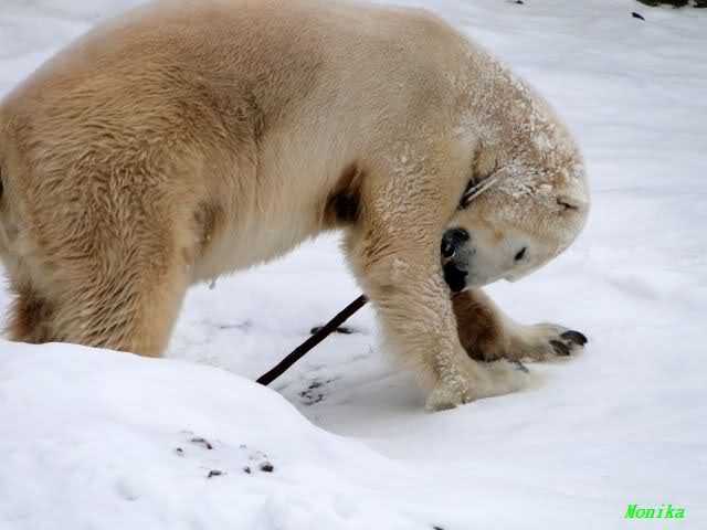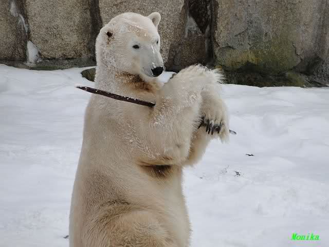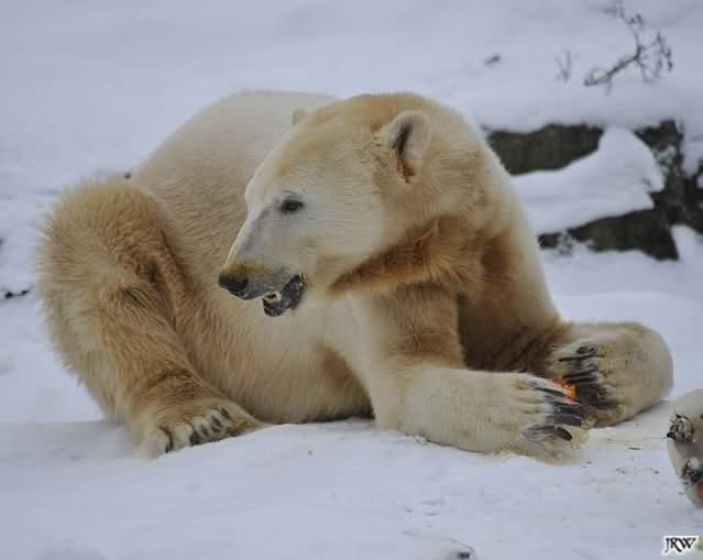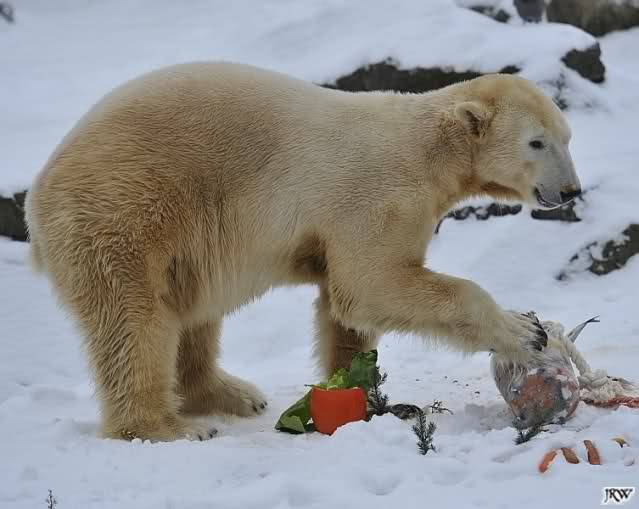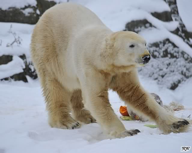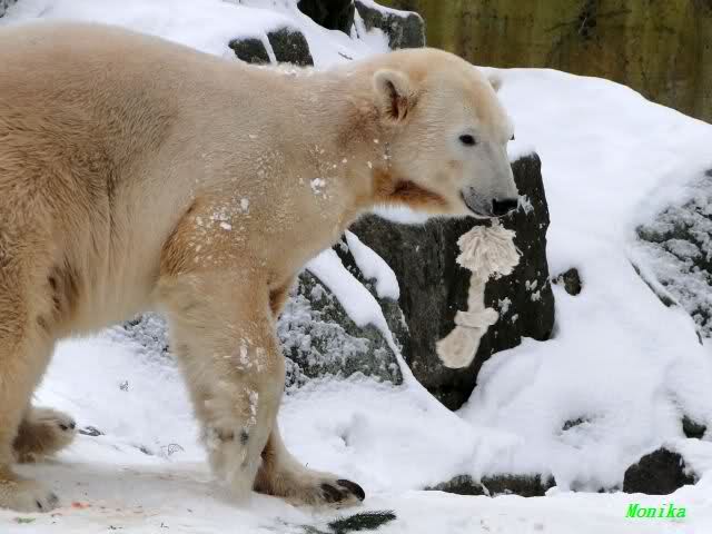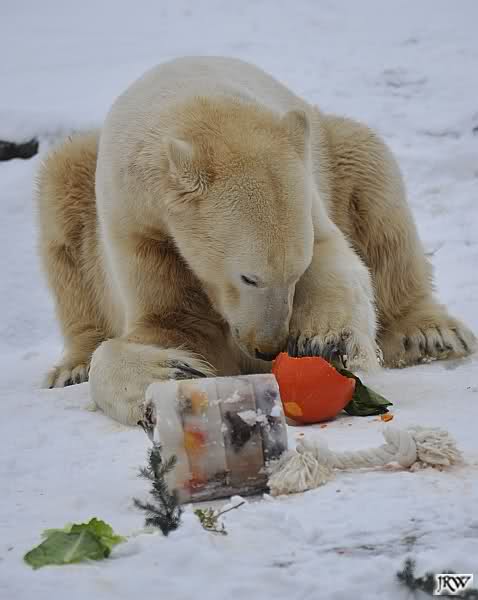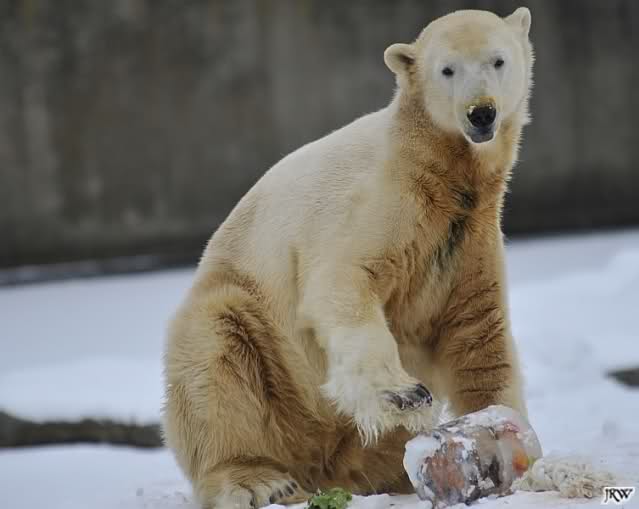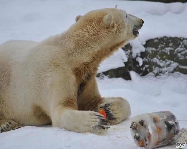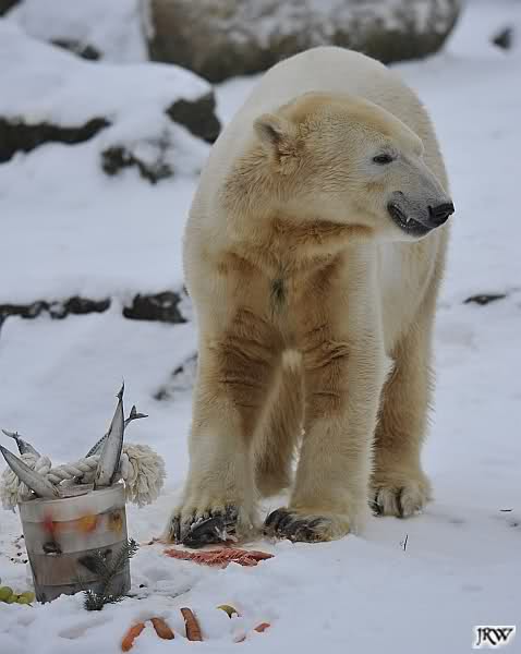 Für Knut war der Geburtstag nett. Er schien sich rundum wohl zu fühlen. Nachdem die Überraschungen von den Pflegern aufgestellt waren, kam Knut langsam heraus auf die Anlage und schaute sich erst einmal um. Nachdem er feststellte, dass er allein war, ging er zielstrebig auf seine Geschenke zu. Man konnte ihm ansehen, wie viel Freude er hatte. Die leckere VIER hatte er bald verspeist und machte sich nach und nach an die anderen Leckereien. Nachdem er an der Eisbombe genibbelt, gekratzt und genascht hatte, stellte er fest, dass man sie auch gut rollen konnte. Es war brechend voll. Sobald man sich auch nur einen Schritt von seinem Platz bewegte, war er weg.