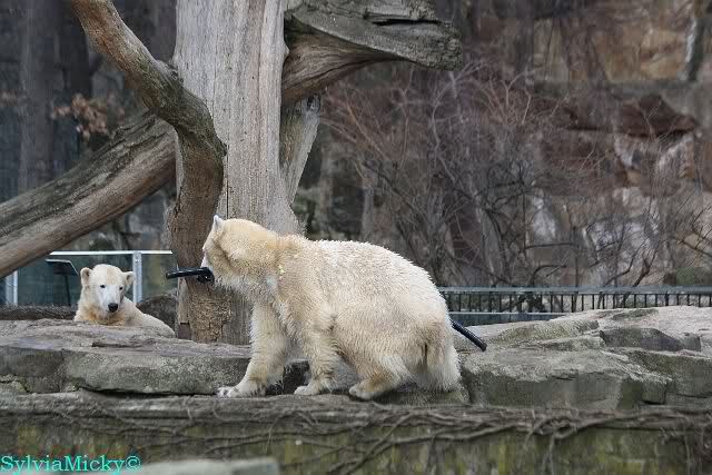 Sie spielte mit den Kugeln und brachte sie zu Knut. Diesmal tat er ihr den Gefallen, er beteiligte sich am Tauziehen. Die Sonne verschönte die beiden Bären noch mehr durch die Licht- und Schattenspiele.