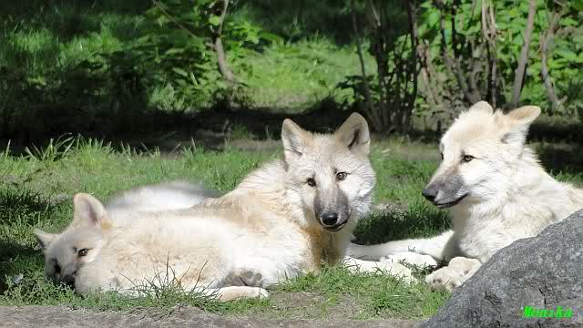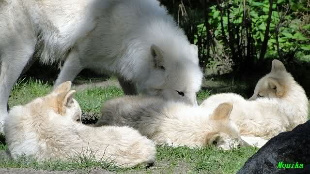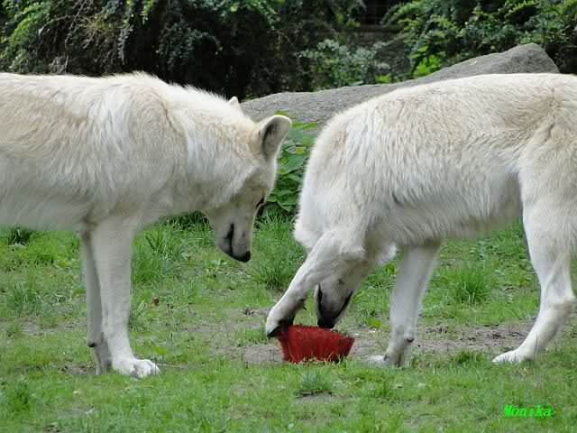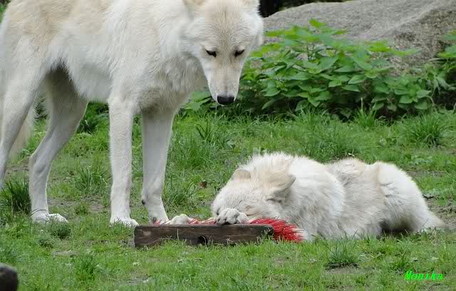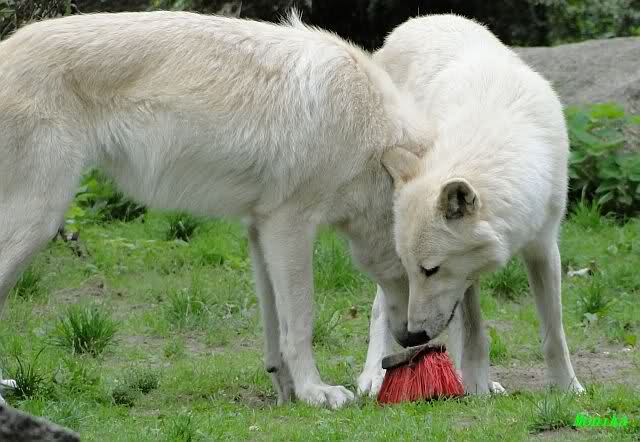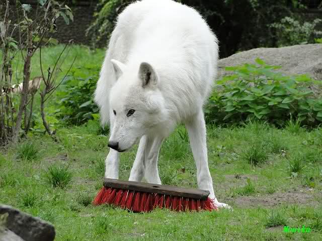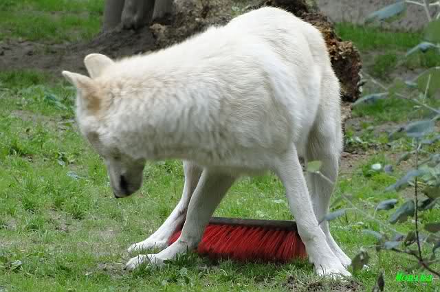 Die Wölfe haben heute "Naturspielzeug" bekommen. Frau Weckert warf einen Besen ins Gehege.