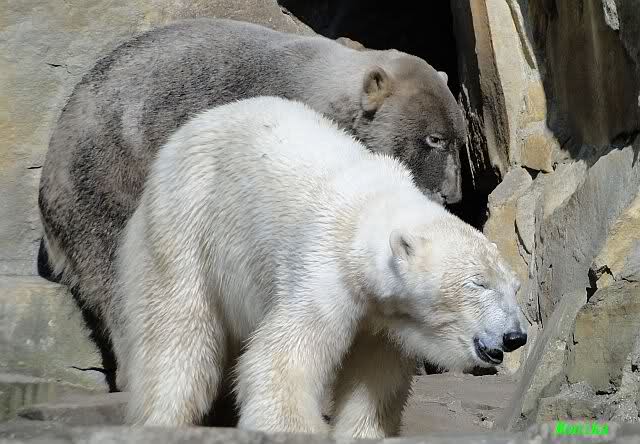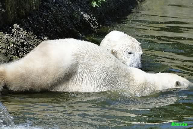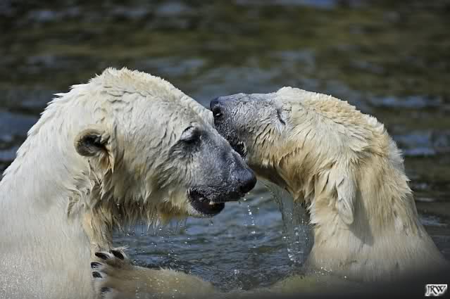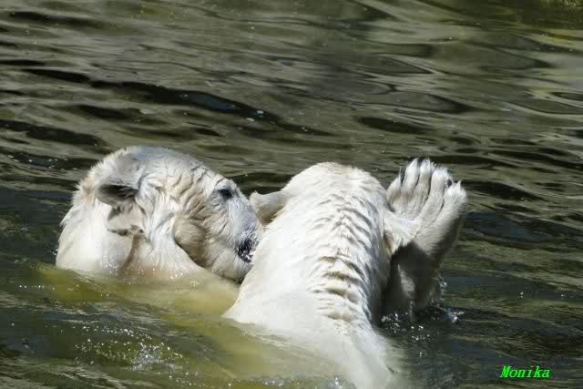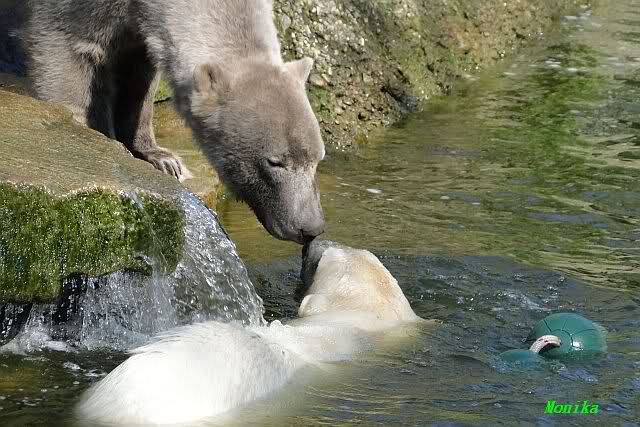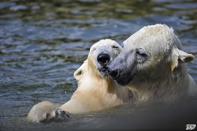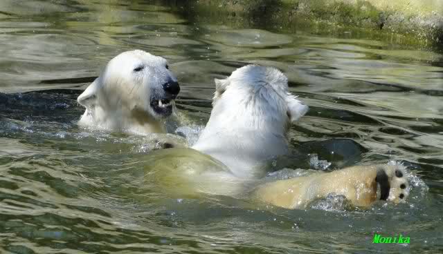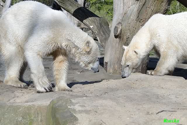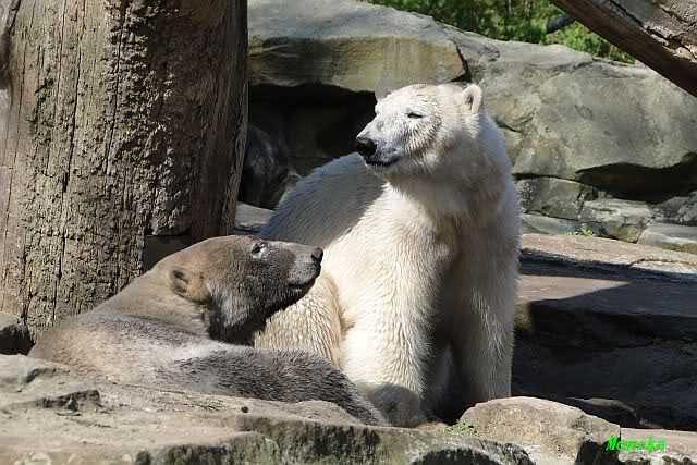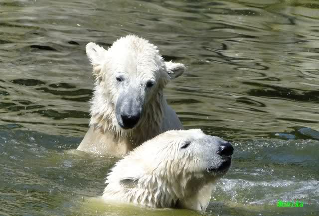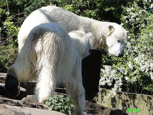 Es ist doch wirklich schön, die beiden Eisbär-Teenager zu sehen, und Knut wieder in seiner herrlichen Farbe!! Mir gefällt er da ganz besonders gut! SylviaMicky, Deine Fotos sind Klasse! Natürlich sind auch Monikas Bilder sehr schön und die von Jessie und Doris, das wißt Ihr alle selbst ganz genau, man kann sich eigentlich nicht genug satt sehen davon. Die Videos von Monika schaue ich mir die nächsten Tage einmal an, da freue ich mich dann schon darauf, das ist eine tolle Sache, wenn man *in der Ferne* die bewegten Bilder sehen kann.