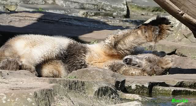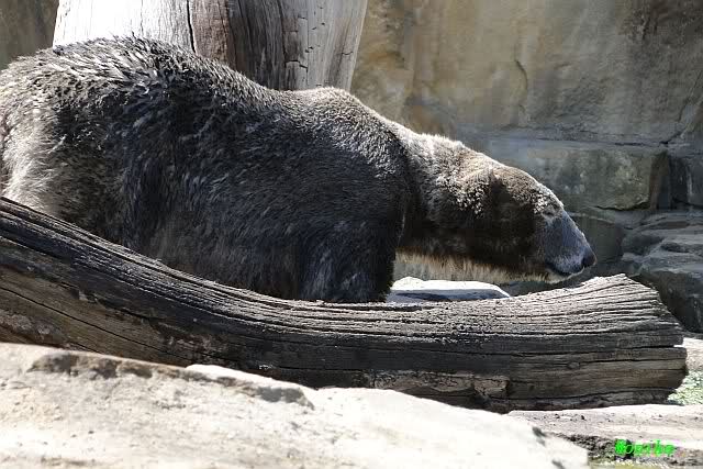 Knut hat sich anschließend ausgiebig im Sand gewälzt und sich wieder in einen Schwarzbär verwandelt. Gianna kletterte derweil den Felsen entlang und plumpste ins Wasser. Wo sie schon mal drin war, spielte sie mit den Kugeln und das Brett. Das Brett wurde wieder hin und her getragen und vom Felsen aus ins Wasser geworfen. Knut ließ sich nicht ins Wasser locken. Er schien sehr müde. Er hat fast sein Mittagessen verschlafen. Als Gianna mittags in die Höhle ging, schlief er tief und fest. Er bemerkte erst gar nicht, dass H. Röbke schon mit dem Futter da stand.