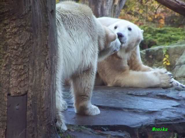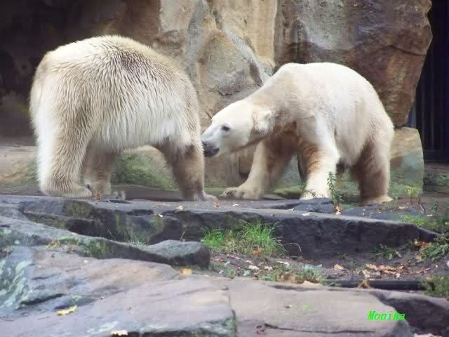 Monika war ganz außer sich vor Freude. Knut und Gianna spielen zusammen. Heute suchte Knut Gianna's Nähe und vor kurzer Zeit haben sie mindestens 5 Minuten hintereinander gespielt. Mit Tatzen und Schnauzen. Mehr konnte ich nicht erfahren, denn sie wollte nichts verpassen.