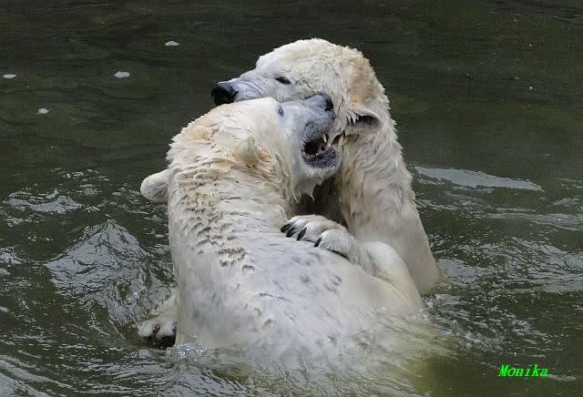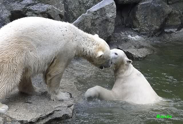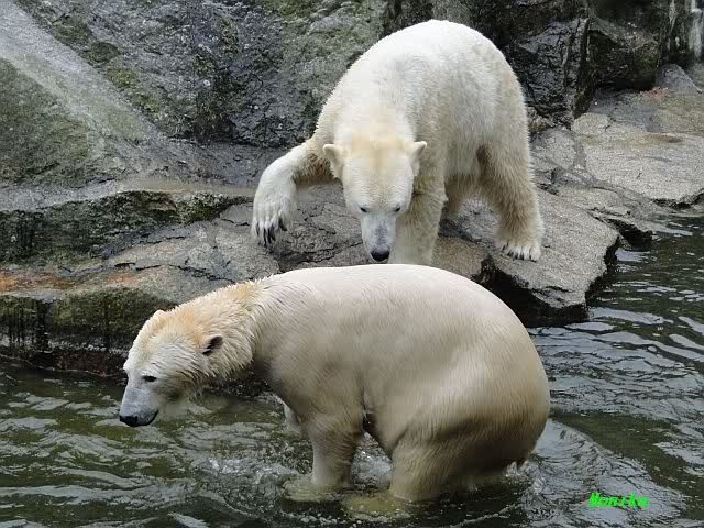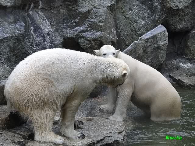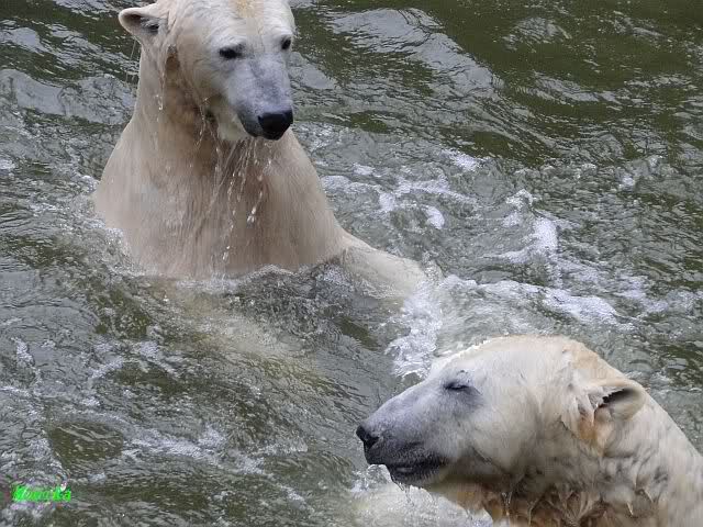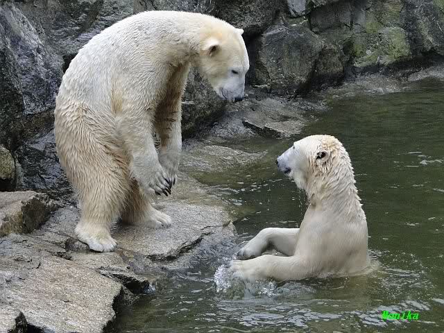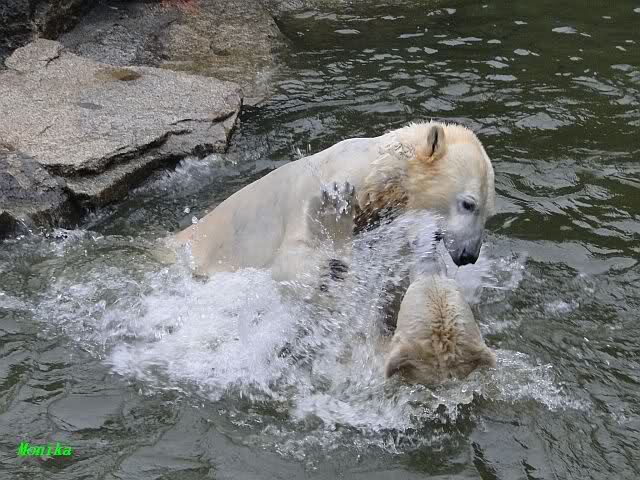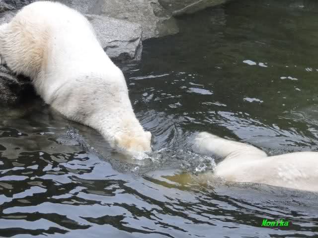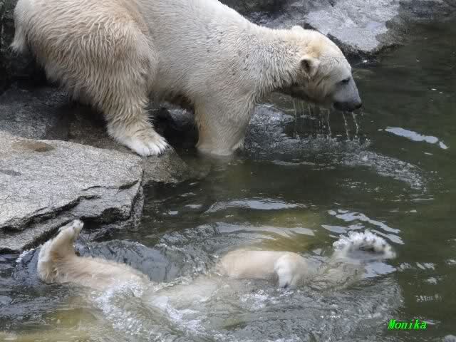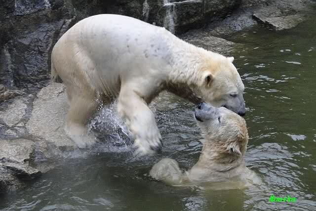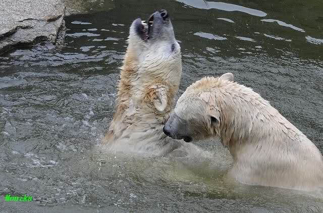 Heute Morgen haben Knut und Tosca erst einmal die Dicke der Eisschicht überprüft. Der Wasserzulauf war noch an. Tosca ging zuerst ins Wasser und animierte Knut auch hinein zu kommen. Der zierte sich noch eine ganze Weile. Da ging Tosca aus dem Wasser und packte Knut am Rücken und schubste ihn ins Wasser und dann begannen wieder schöne Wasserspiele. Ich finde, dass sie heute nicht so rabiat miteinander umgingen sondern eher soft.