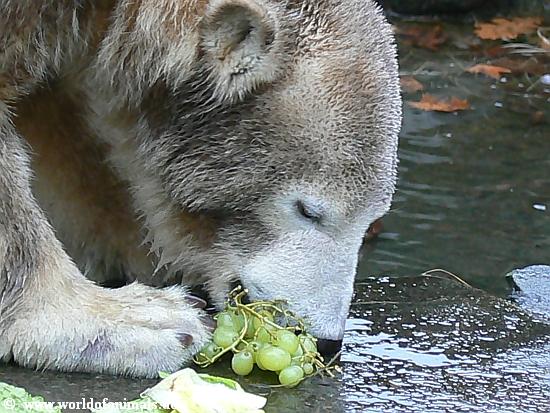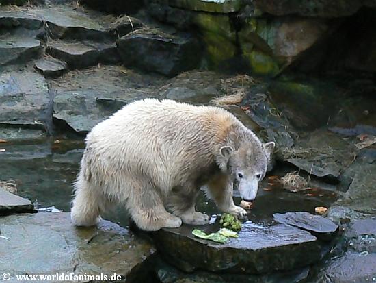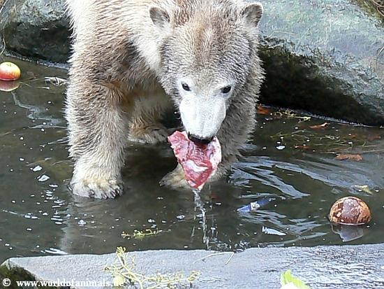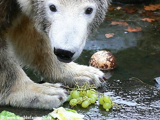 Sehr früh gab es heute Futter für Knut. Sein Ziehpapa Dörflein ist heute und morgen nicht da. Also fütterte eine Tierpflegerin. Es gab ein großes Stück Fleisch, ein Brötchen, einen Fisch, Salat und eine große Portion Weintrauben, die er als erstes futterte.