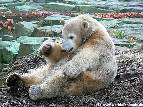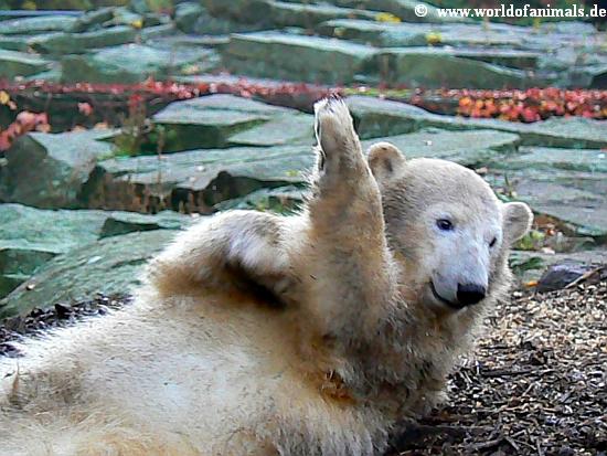 Unser Knutsi ist ja richtig suess darauf! Wenn man bedenkt, dass aus ihm am Ende ein Raubtier wird......, aber das soll er ja auch sein, ein richtiger Polar Bear!