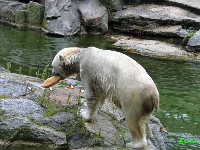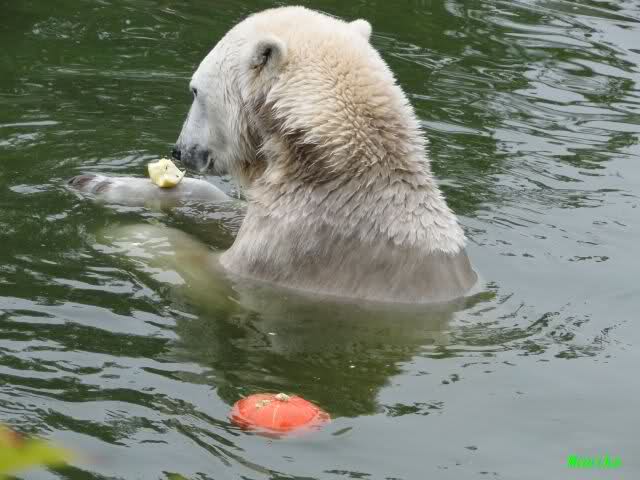 Ich wollte eigentlich heute morgen nur eine Stippvisite bei Knut machen. Als ich gerade gehen wollte, stand Knut auf und ging ins Wasser. Also blieb ich. Er schwomm erst ein Weilchen und fand dann reges Interesse an der Scheibe. Immer wieder kam er, als wollte er schmusen und gekrault werden. Wenn er die Hände an der Scheibe sah, drehte er seinen Kopf hin und her. Außerdem friemelte er lange untenterhalb der Scheibe. Man konnte ein knackendes Geräusch hören. Für kurze Zeit hatte er auch den Baumstamm in den Pfoten. Als er dann einen Zweig im Wasser fand und anfing zu spielen, kam Fr. Weckert mit dem Mittagessen. Knut reagierte erst nach einigen Rufen. Er kam ganz langsam angeschwommen. Die Fütterung lief ähnlich ab wie gestern. Als dann das große Weißbrot auch noch auf die ehemalige Insel von Lars viel, versuchte er immer wieder auf die Insel zu kommen, rutschte ein paar Mal ab. Nach Anfeuerungsrufen, auch durch die Pfleger, hat er es dann geschafft. Es folgte Applaus.Dann fraß Knut erstmal alles, was er auf der Insel fand. Als er dann wieder hinunter wollte, fing die Schnauze wieder an zu zittern. Aber nur kurze Zeit, dann war er im Wasser und beschäftigte sich lange mit einem Kürbis. Dann bin ich gegangen.