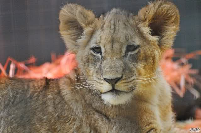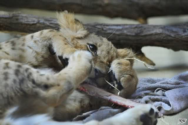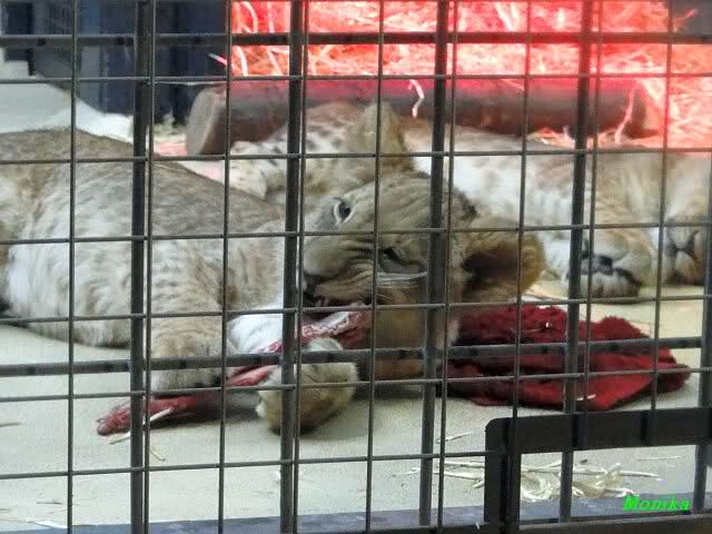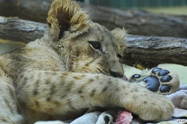Einer der kleinen Löwen schlief während sein Bruder an einem Knochen knabbert.