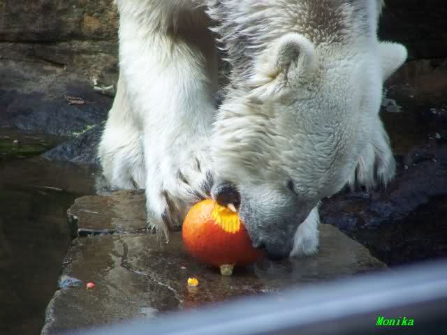 Wie Sylvia schon schrieb, tobte Knut heute früh schon im Wasser. Zwischendurch machte er ein kleines Schläfchen um danach wieder frisch und munter weiter zu toben. Die Fütterung war wie in den letzten Tagen wenig spektakulär. Heute gab es zum Dessert einen Kürbis.