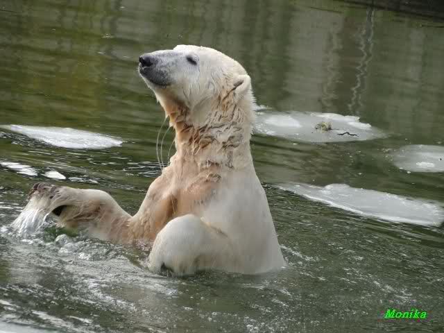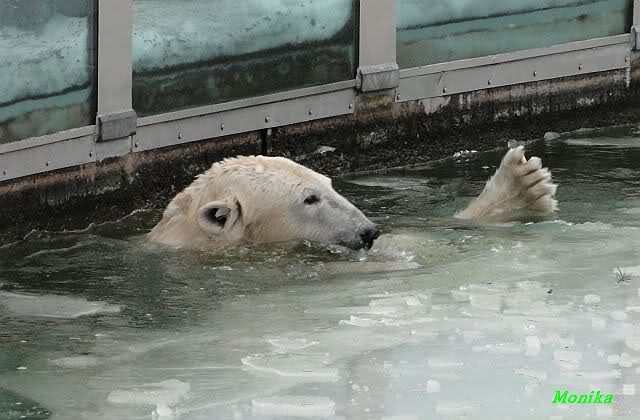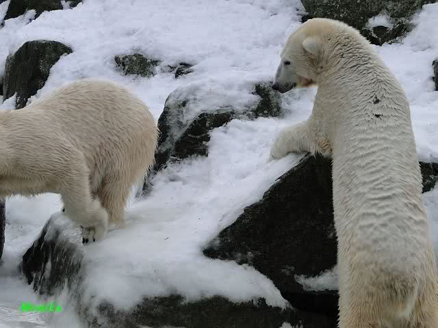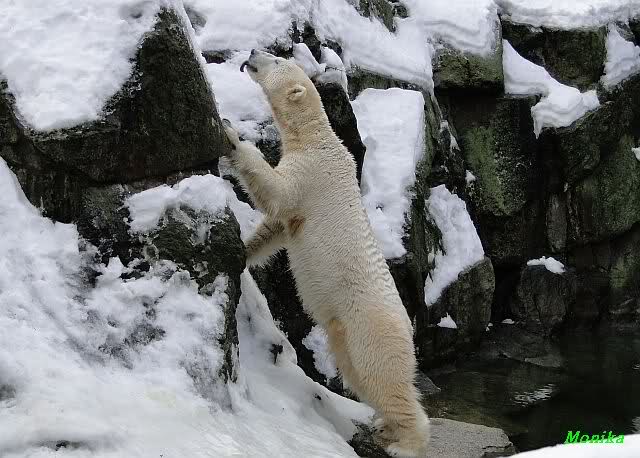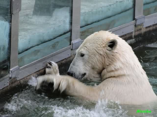 Knut jedoch war immer noch sehr munter. Er spielte noch lange im Wasser mit den Eisschollen. Insgeheim hoffte er wohl, dass Tosca auch kommt. Der Blick ging immer wieder nach oben. Als Knut dann doch müde wurde und nach oben ging, dachte er wahrscheinlich, dass die Mädels schon drinnen sind. Er ging auf die Anlage und schaute, konnte sie aber nicht entdecken. Erst als er auf dem mittleren Plateau stand, sah er sie. Er ging dann zu seiner Ecke und schloß auch die Augen.