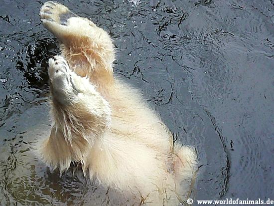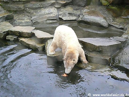 Kurz nach 14:30 Uhr kam auch heute wieder, zur Überraschung vieler Besucher, Thomas Dörflein zur Fütterung. Es gab vier Fische für Knut (die alle im Wasser landeten), eine Zwiebel, eine Birne, etwas Salat und natürlich Weintrauben. Knut hat sich alle Fische aus dem Wasser geholt. Er wirbelte zunächst mit seinen Tatzen das Wasser auf, gleitet dann ins Wasser und ... hatte den Fisch.