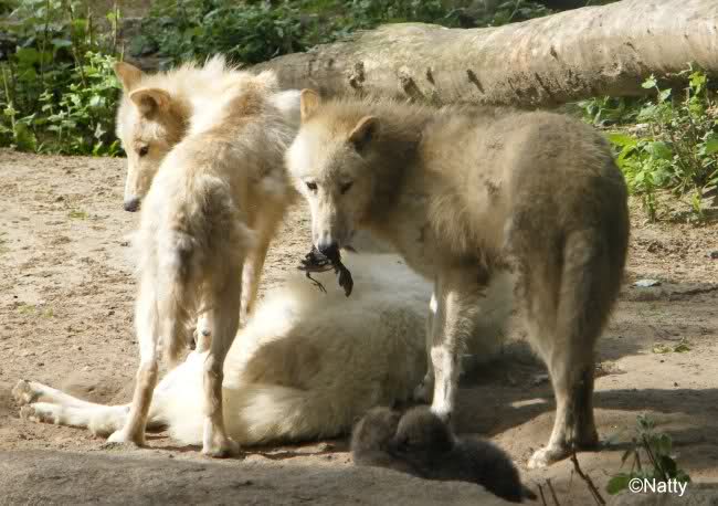 Mamma Wolf hatte einen Vogel zwischen den Zähnen, zuerst legte das Weibchen die Beute auf den Körper von Pelle, der legte jedoch wenig Wert auf dieses Federvieh. Aber ein kleiner Wolf kam angerannt und schnappte sich den Vogel und ist weggelaufen, wollte ihn alleine fressen, mutig! Aber die Beute konnte der kleine Wolf nicht lange behalten, die Mutter hat den Vogel ihr abgenommen, weggeschleppt und verspeist.