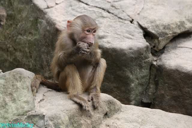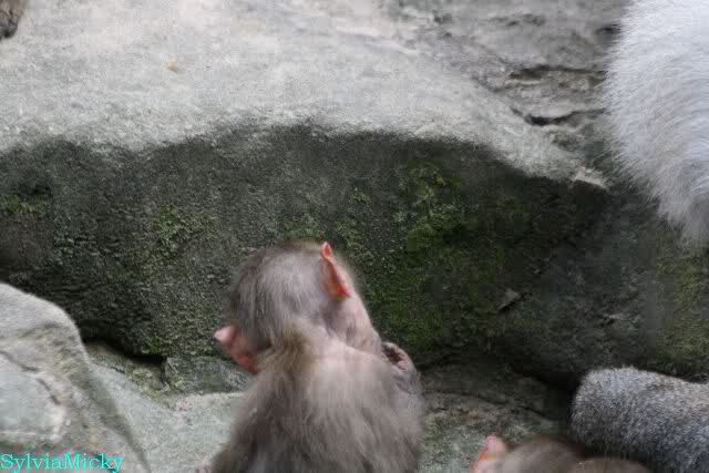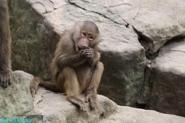 Die kleinen Mantelpaviane haben noch Schwierigkeiten die Nüsse zu knacken