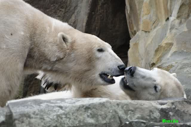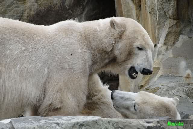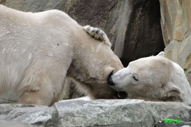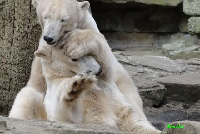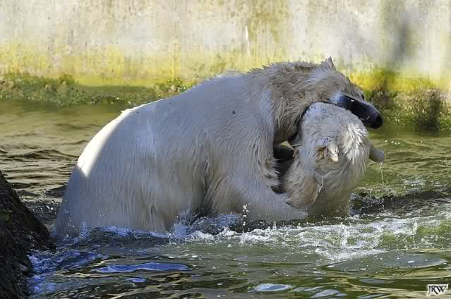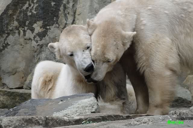 Ja Sylvia, heute ist es ein wenig ungemütlich, aber bei Knut und Gianna schien heute die Sonne. Ich würde den Vormittag so beschreiben: "Knut und Gianna in Love". Knut fing heute morgen schon an Gianna "anzubaggern". Sie ließ sich nicht lange bitten. Immer wieder wurde geschmust. Am schönsten war es als beide gemeinsam unter dem Baum saßen und schmusten. Es war sooo süß. Als ein kräftiger Graupelschauer aufkam, wurde im Wasser weiter geschmust und auch gespielt.