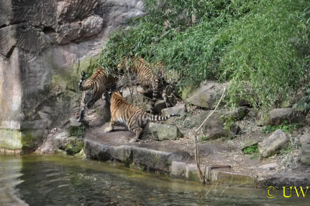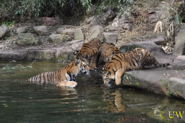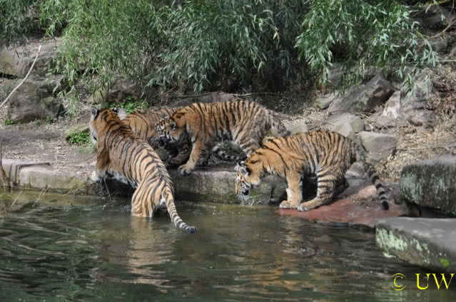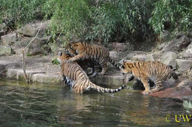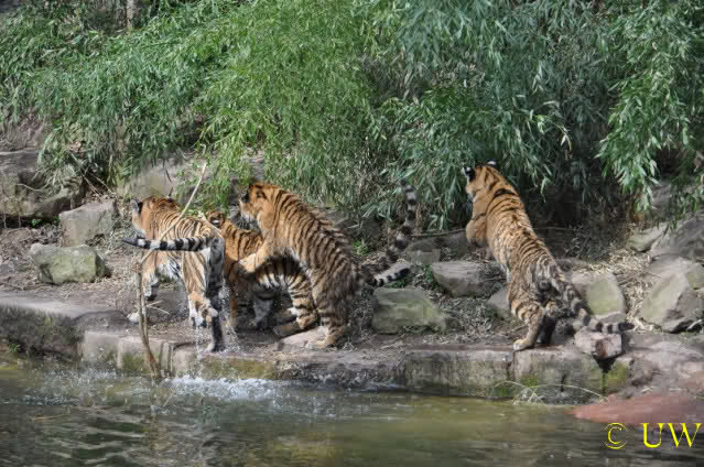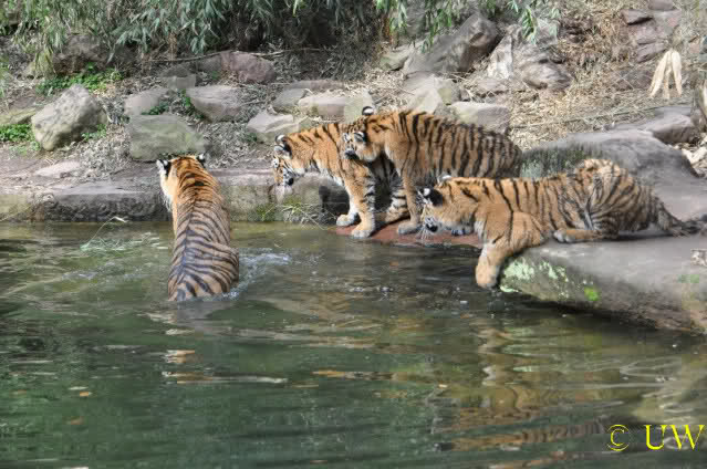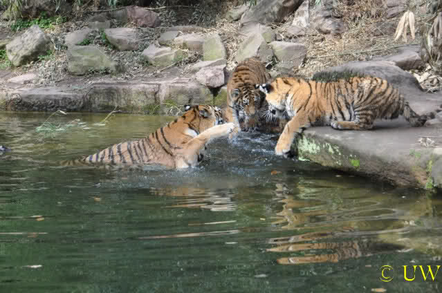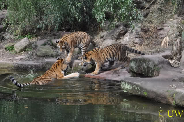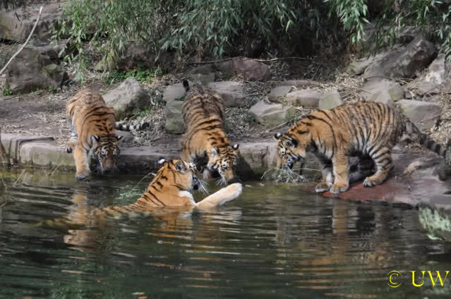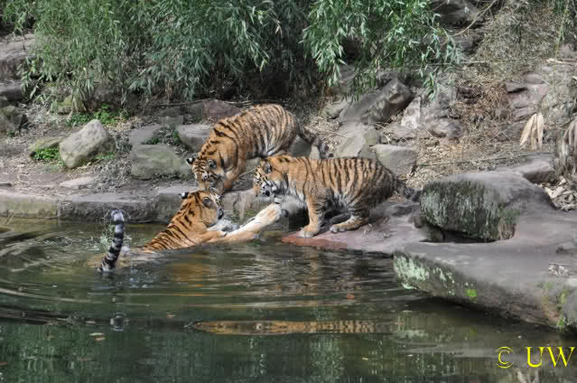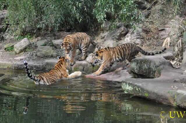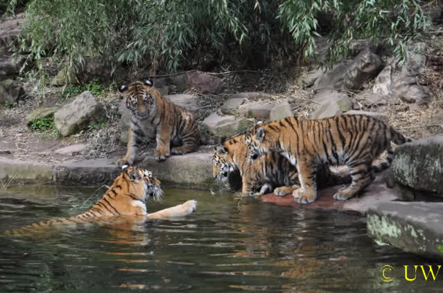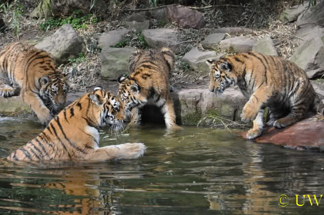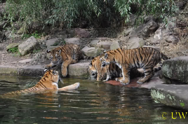 Die kleinen Tiger ärgern ihre Mutter und wollen sie nicht aus dem Wasser lassen