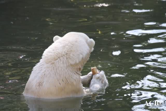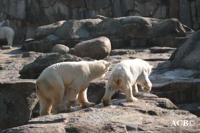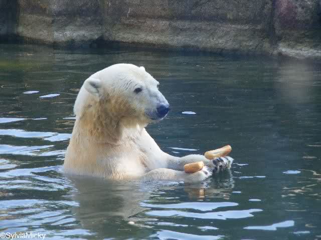 Am Nachmittag gab es einen Kindergeburtstag. Daher bekamen die Eisbären von den Kindern Brötchen und Nüsse ins Gehege geworfen.