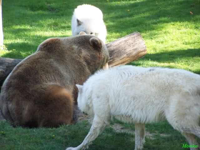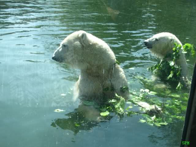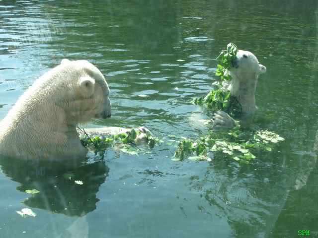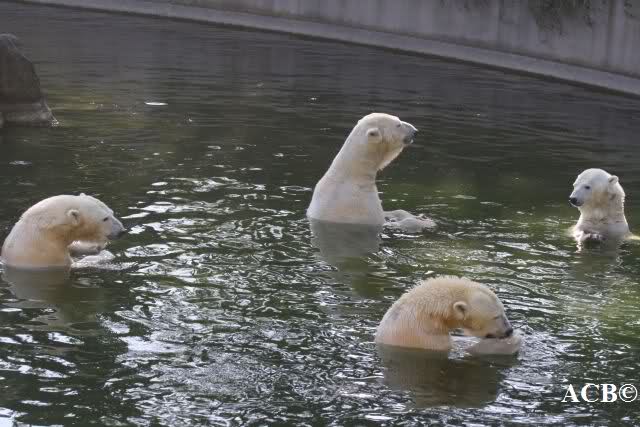 Wie Sylvia schon oben geschrieben hat, war heute eine Kindergruppe bei den großen Eisbären. Deshalb gab es eine willkommene Nachmittagsspeisung. Alle vier haben es genossen: