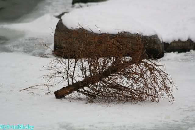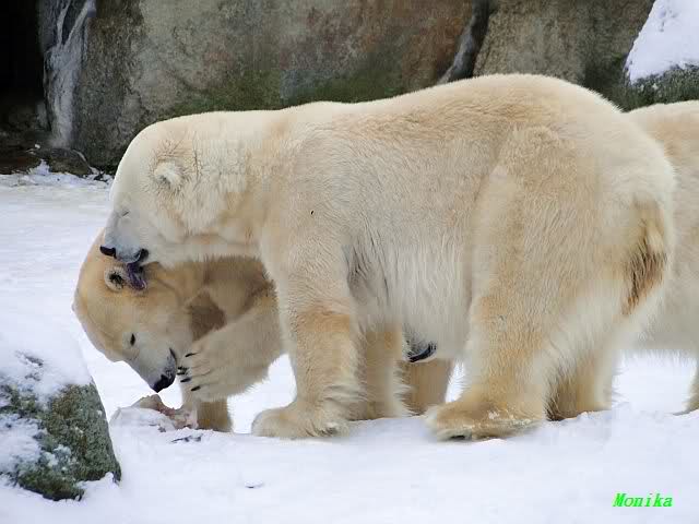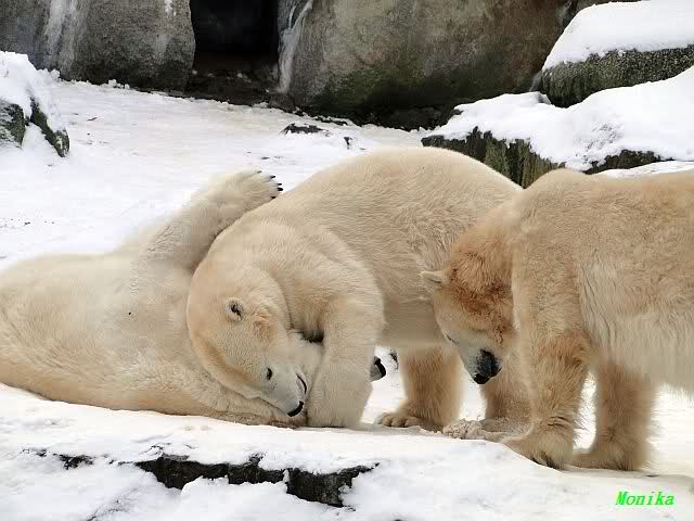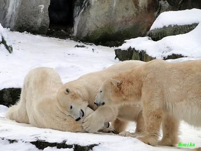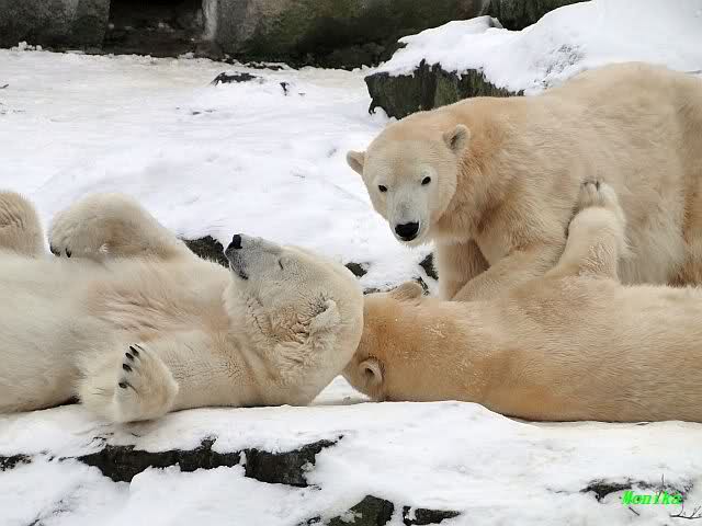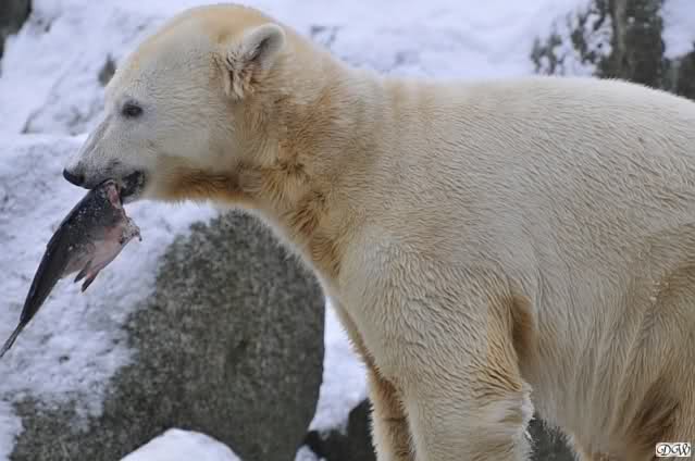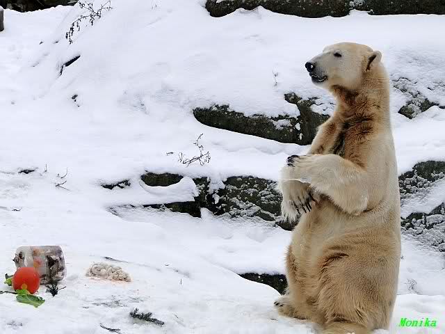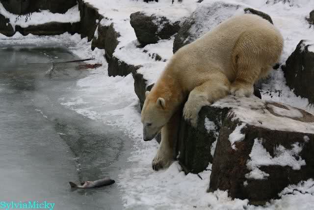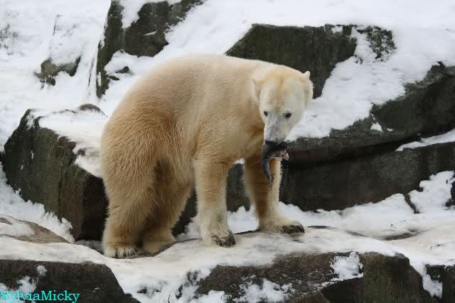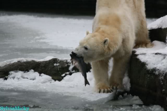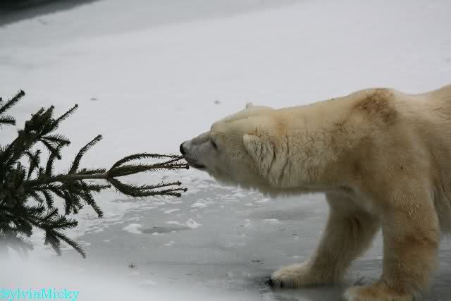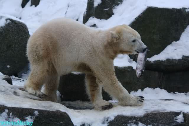 Knut bekam auch noch einen Lachs. Als Kati ankam, trug er den Fisch auf die Anlage. Zum Glück wurde Kati durch den Baum (der Grüne), der auf dem Eis lag, abgelenkt. Sie zog ihn auf die Anlage und wollte ihn auf die Anlage tragen. Dann kam Tosca. Aber so interessant war für sie der Baum nicht. Als Knut auf seine Ecke wollte, lag da der Baum. Er ging vorsichtig hin und beschnupperte ihn. Da sah man deutlich den Unterschied im Verhalten zu den anderen Bären. Während Kati den Baum fast zerlegte und Tosca auch keine Angst zeigte, war Knut sehr vorsichtig. Als der Baum sich bewegte, weil er direkt auf der Ecke lag, ging Knut vorsichtshalber einige Schritte zurück.