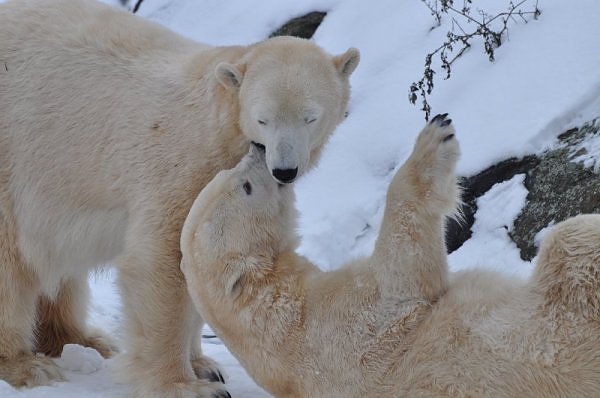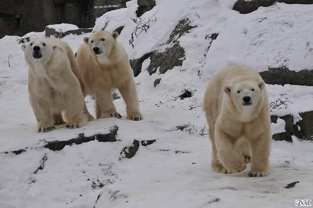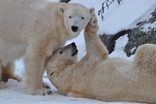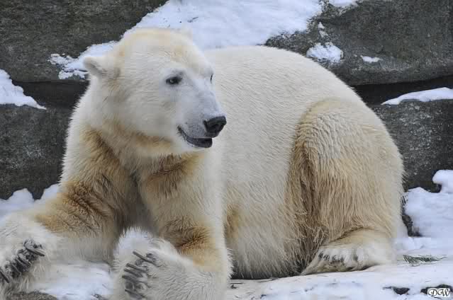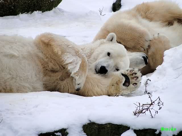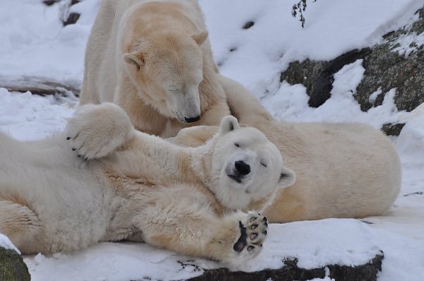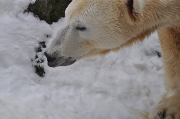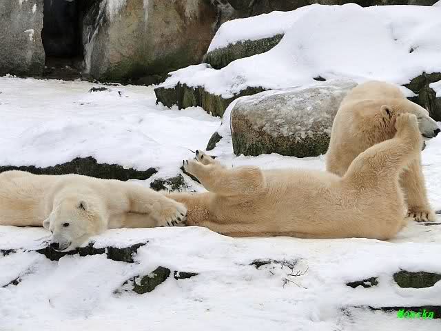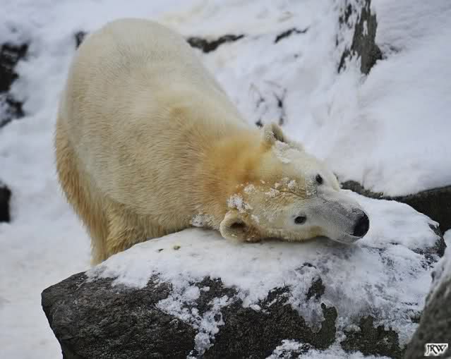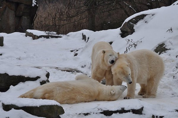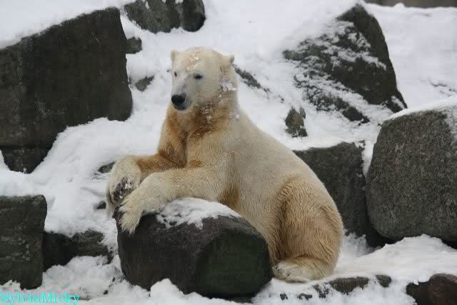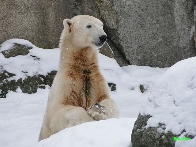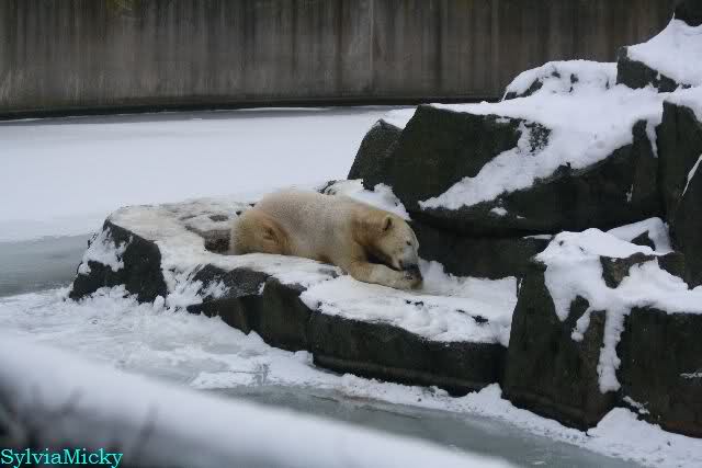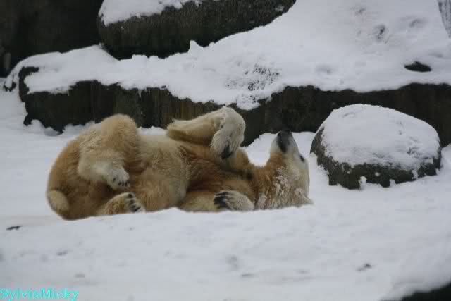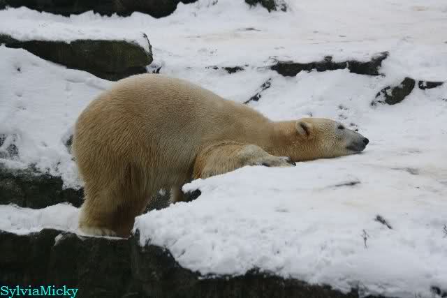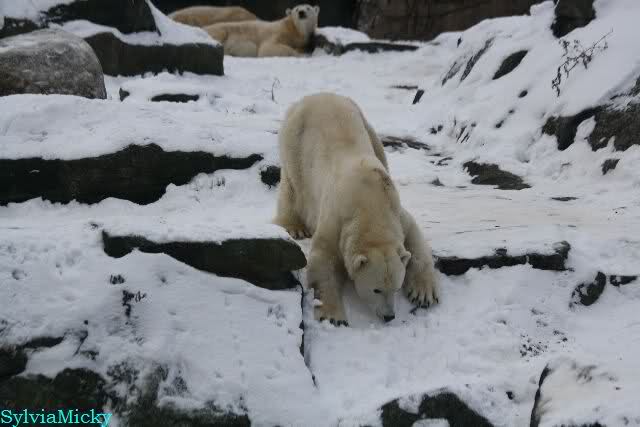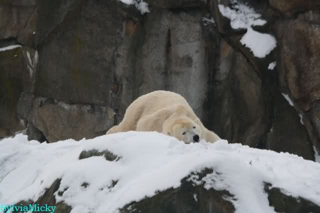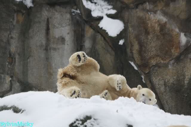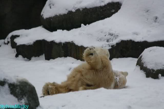 Dann ging er auf die Anlage und rollte sich auf dem mittleren hinteren Teil im Schnee. Und das obwohl die Bärinnen auf der Anlage waren! Tosca und Nancy lagen hinten rechts. Kati sah ich nicht.