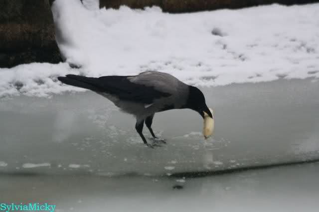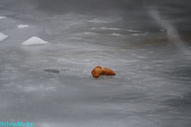 Das Croissant landete auf dem Eis und die Krähen freuten sich