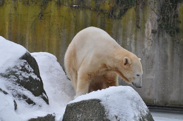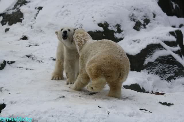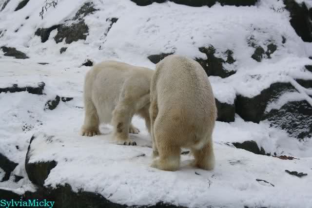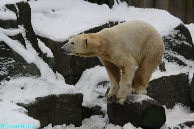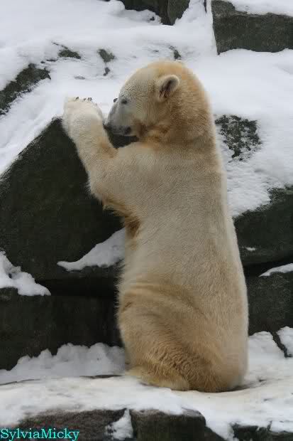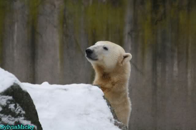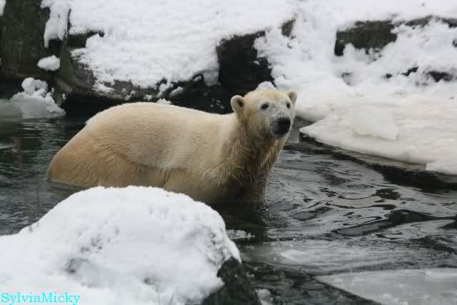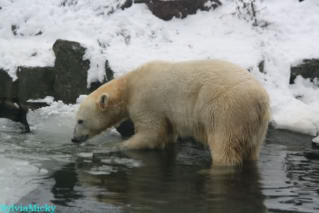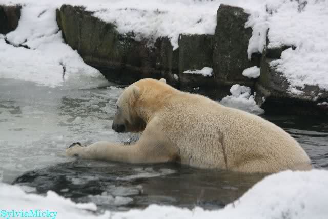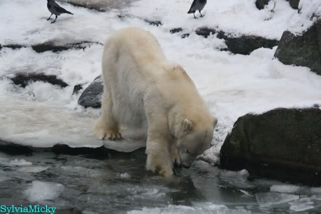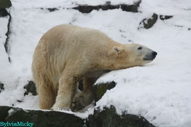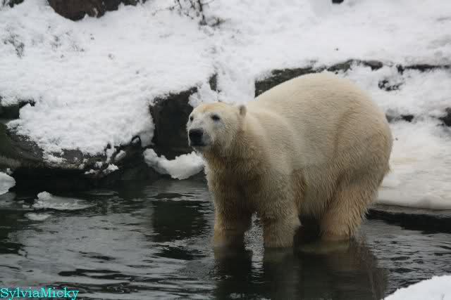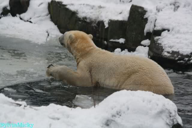 Das ging eine Weile so, bis die übergewichtige Spielverderberin angepest kam. Es gab dann lautes Gefauche und Gebrumme und Knut ging wieder auf die untere Seite und versuchte sich dort an den Steinen zu schubbern. Dann ging er zum zweiten Mal ins Wasser. Rieb sich dann aber vorsichtshalber vorne rechts im Schnee.