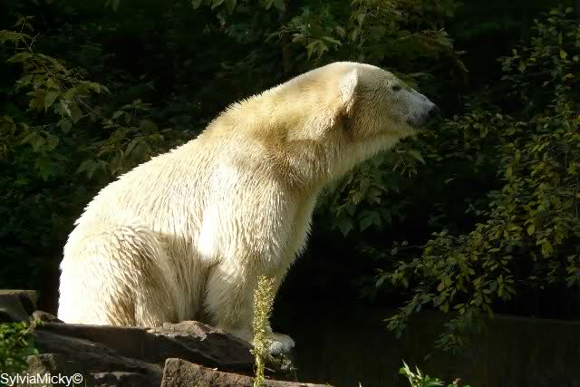 Als ich gegen 18.00 bei Knut nochmal vorbei ging war von ihm nichts zu sehen. Ich denke, er ist in einen komaähnlichen Schlaf gefallen. Eine Stammbesucherin erzählte mir, daß Knut heute seinen Sandhaufen mit Fauchen verteidigt hat. Kurz nach der Fütterung sagte sie, spielte Knut mit einem Ball im Wasser. Gianna wurde dann rausgelassen und Knut lief auf die Anlage. Heute Nachmittag sah man bei Knut öfters die vorgeschobene Lippe.