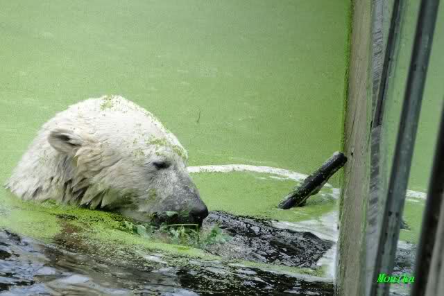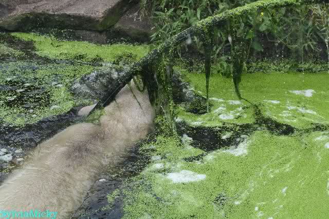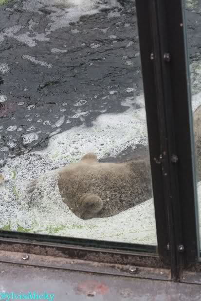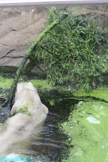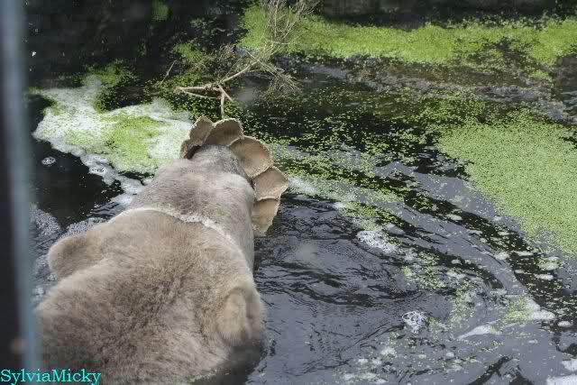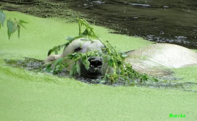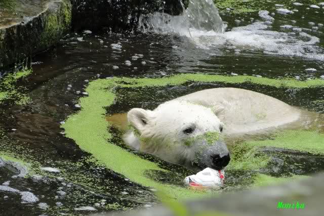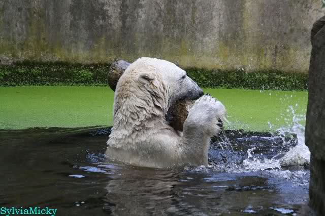 Heute Morgen hat Knut wieder lange geschlafen. Er brauchte eine Weile um richtig munter zu werden, und ging dann ins Wasser. Er spielte den ganzen Vormittag mit allem was er im Wasser fand. Außerdem übernahm er Giannas Part und spielte Staubsauger. Er tauchte immer wieder ab und kam kauend wieder hoch.