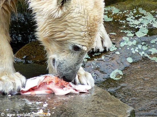 Knut war heute sehr lebhaft. Lief in seiner Anlage auf und ab und hielt Ausschau nach dem Pfleger, der gegen 14:30 h endlich mit Futter kam. Gefüttert hat auch heute Markus Röbke. Knut bekam ein, zwei Äpfel, Kartoffeln, Salat, eine Morübe, Fleisch, natürlich seine von Uli gesponsorten und geliebten Weintrauben und einen auch von Uli gesponsorten riesigen Lachs, den er mit Genuss verspeiste und sich zum Abschluss beide Vorderpfoten ableckte