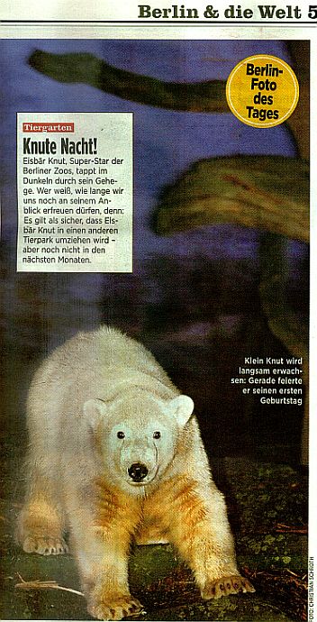 Hallo, liebe Knutianer-Die BZ kann es nicht lassen-sie muss immer wieder die Diskussionen anschüren, ob Knut in Berlin bleibt oder gehen muss. Es wird wahrscheinlich sein, aber es ist noch nichts entschieden. Fast jeden Tag die gleiche Leier dieser schrecklichen Zeitung und dann noch das Bild mit Blitz fotografiert--!! Der Zoo müsste diesbezüglich ein Schild aufstellen, dass nicht mit Blitz fotografiert werden darf-aber daran würden sich solche Reporter bestimmt auch nicht halten.