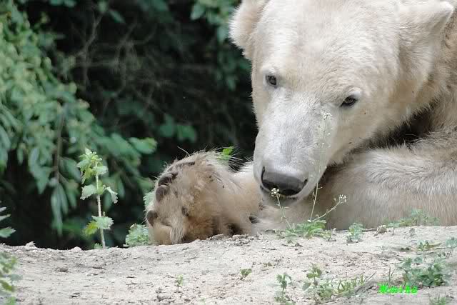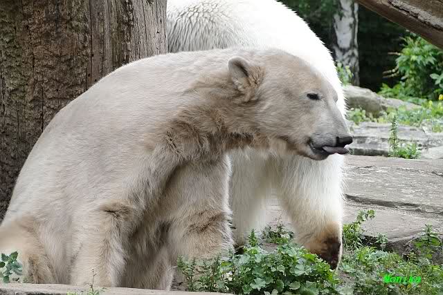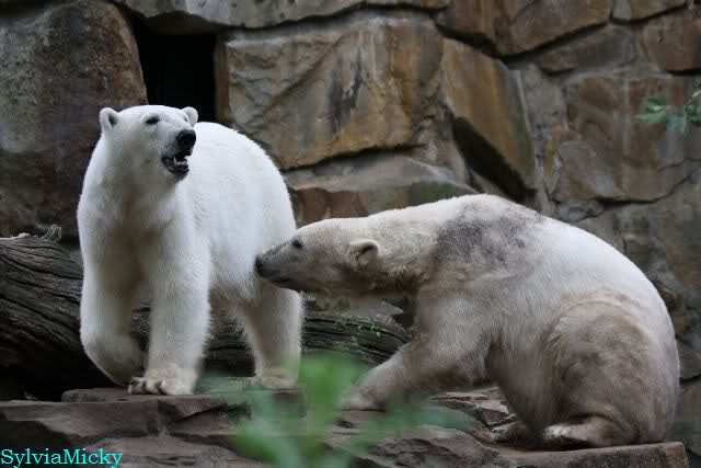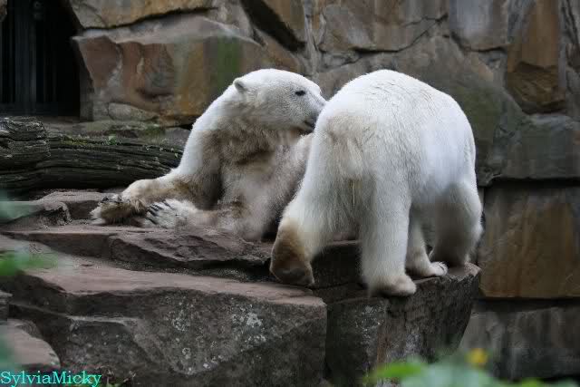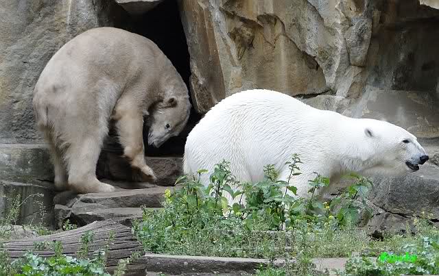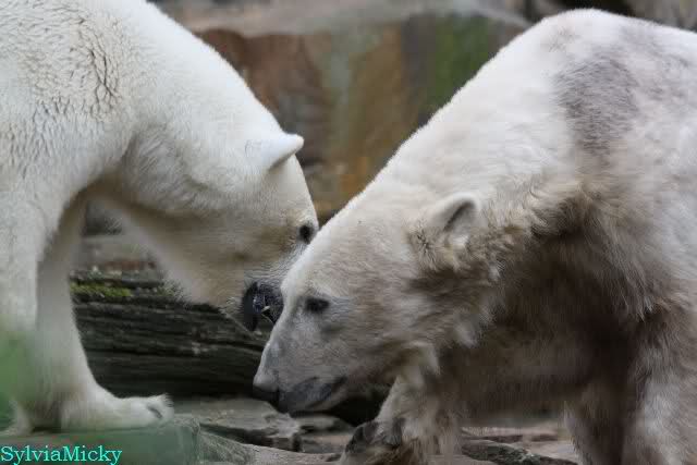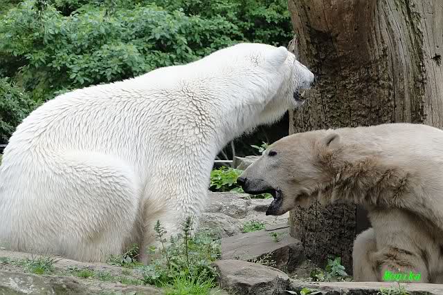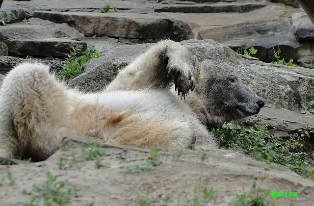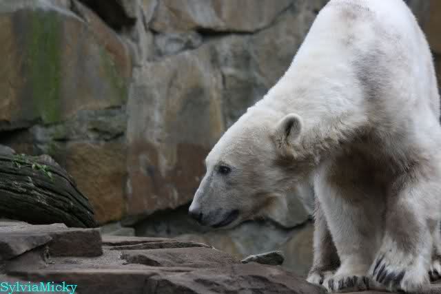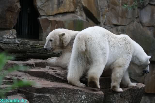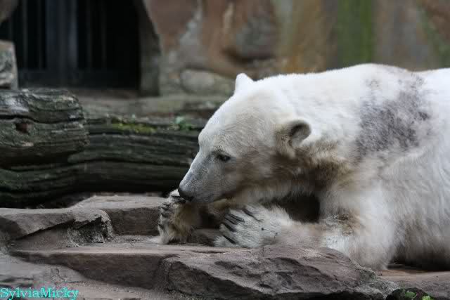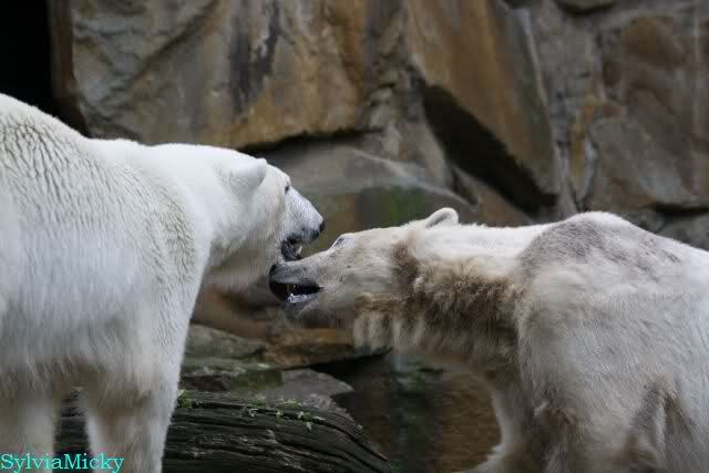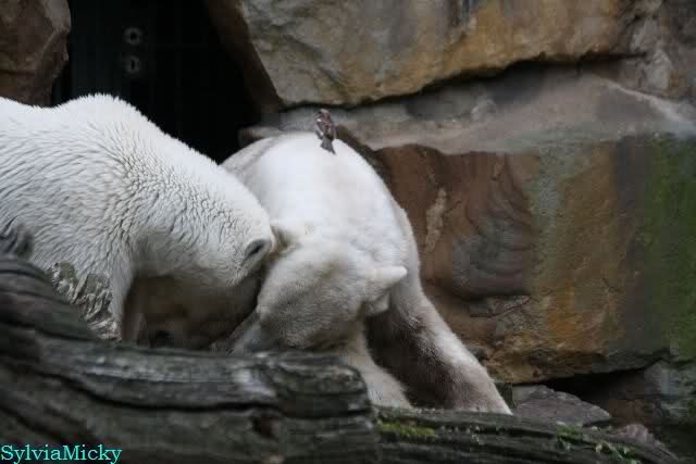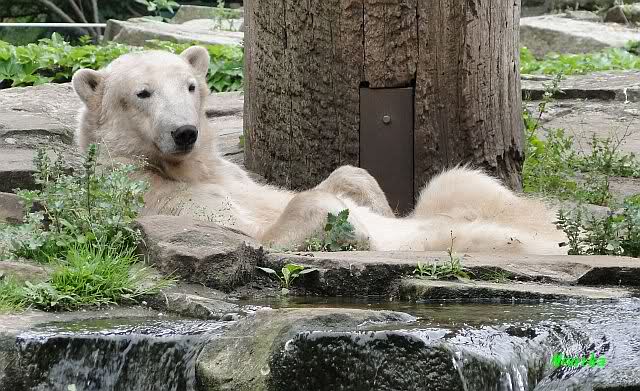 Eine Knutfreundin erzählte mir, daß die Braunbären sich gestritten haben. Gianna hatte sich sehr erschrocken und lief zu Knut hin der unter dem Baum lag und schlief. Er brummte sie aber weg. Gianna lief den ganzen Vormittag und setzte sich erst gegen eins hin.