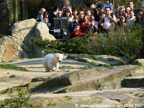 Heute habe ich wieder in meiner Bilderkiste mit den Fotos der Knut-Show gewühlt und einige bisher nicht von mir gezeigte Fotos gefunden. Heute Aufnahmen vom 1. April 2007. Bereits nach einer Woche war das Ansturm von Besuchern im Zoo so groß, das man zur Anlage der Braunbären umziehen musste.
