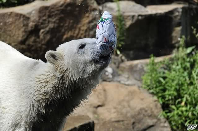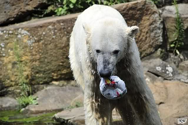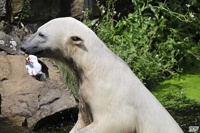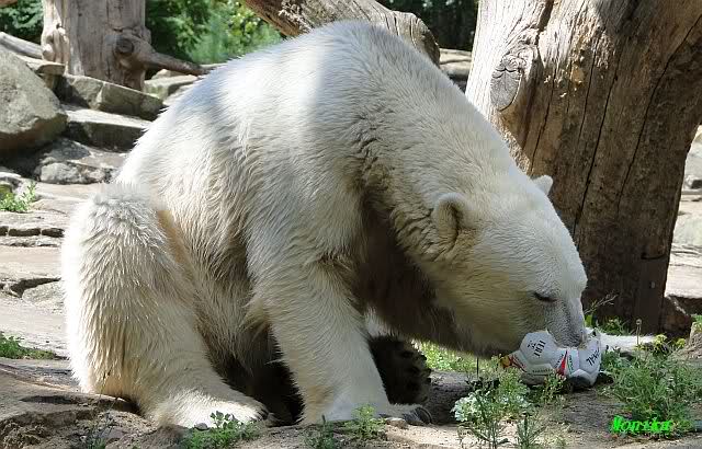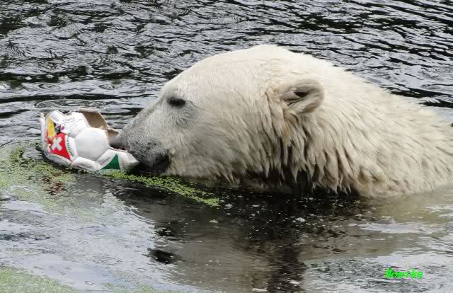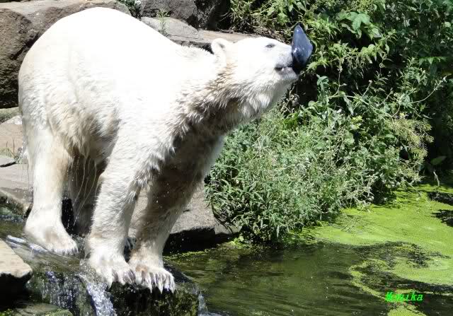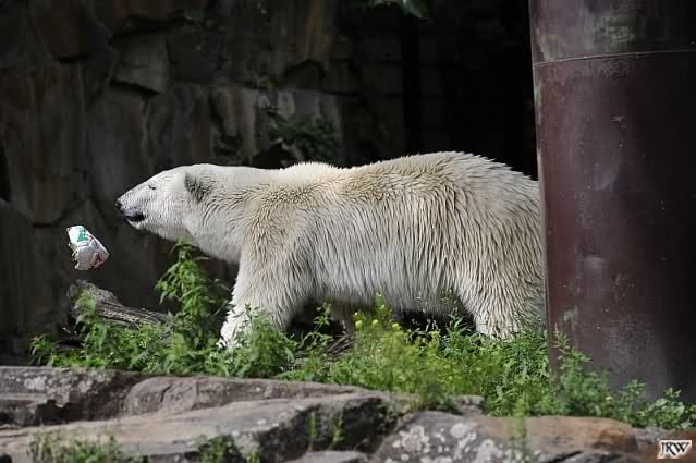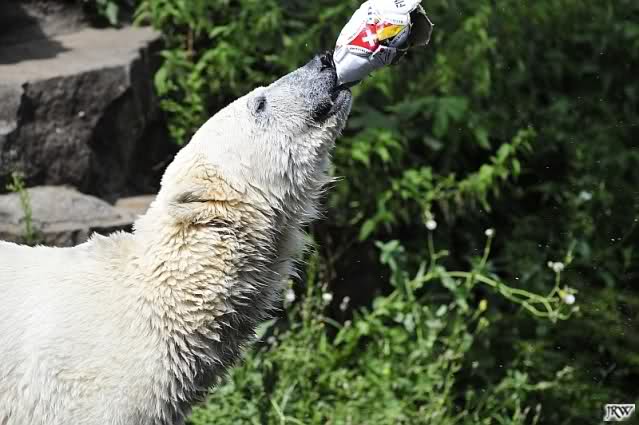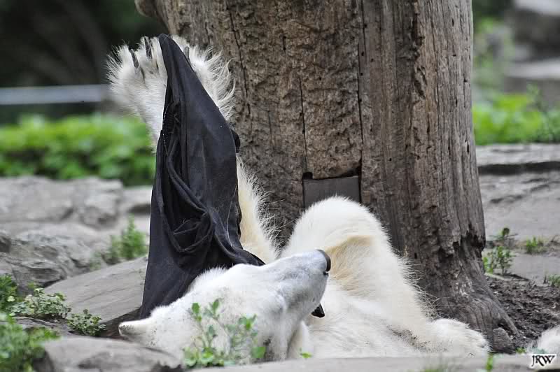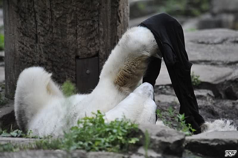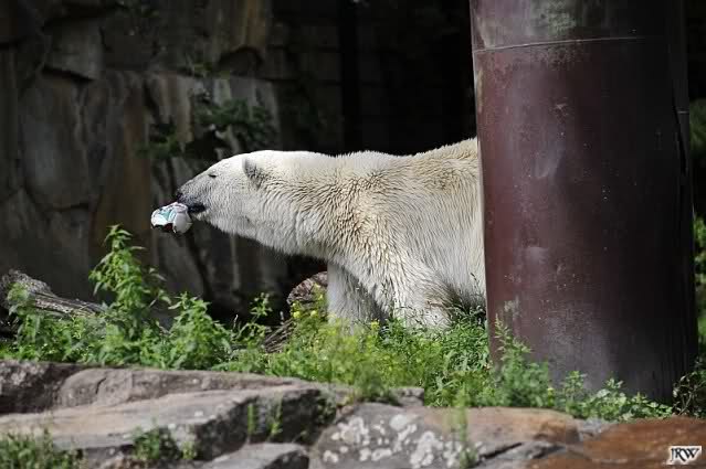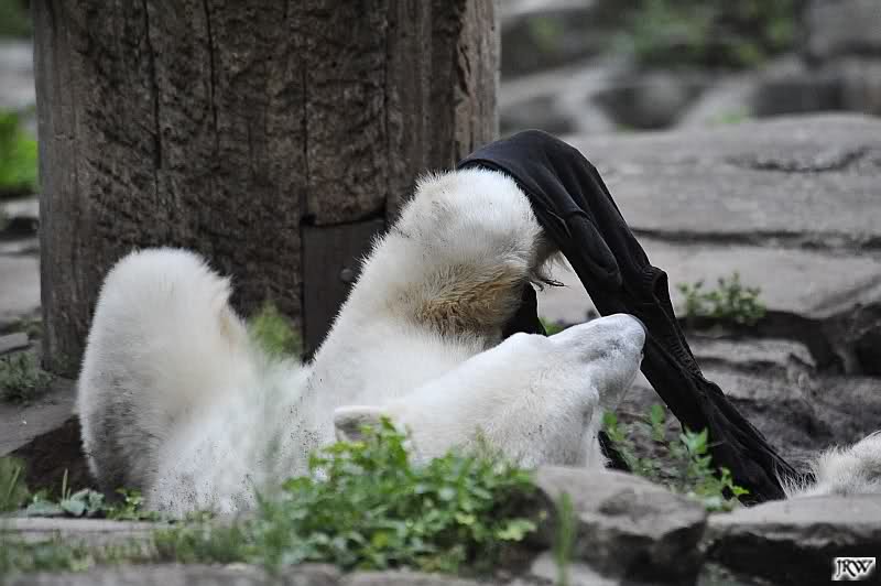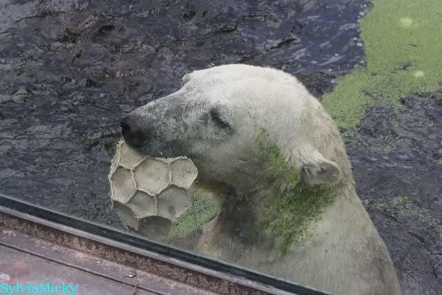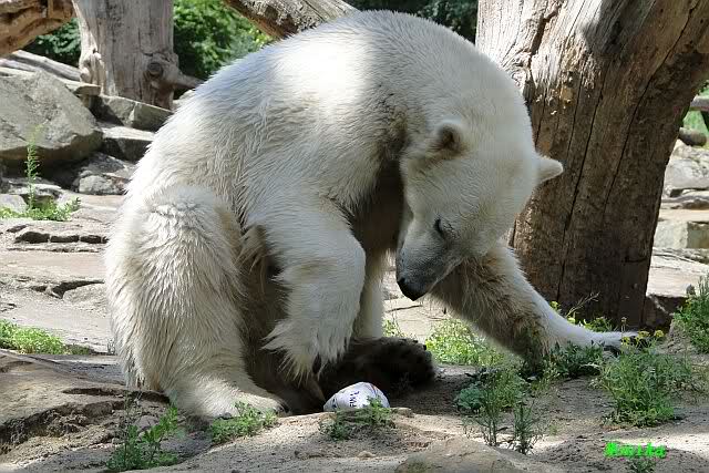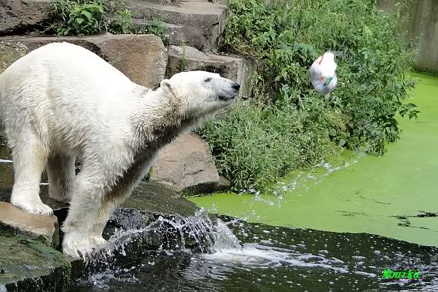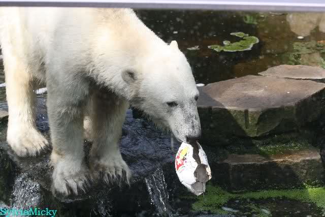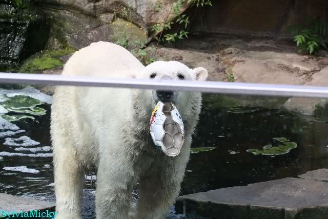 Knut warf den Ball einmal zu den Besuchern, als er zurück flog schnupperte er dran und ließ ihn liegen. Roch wohl nicht gut.