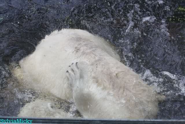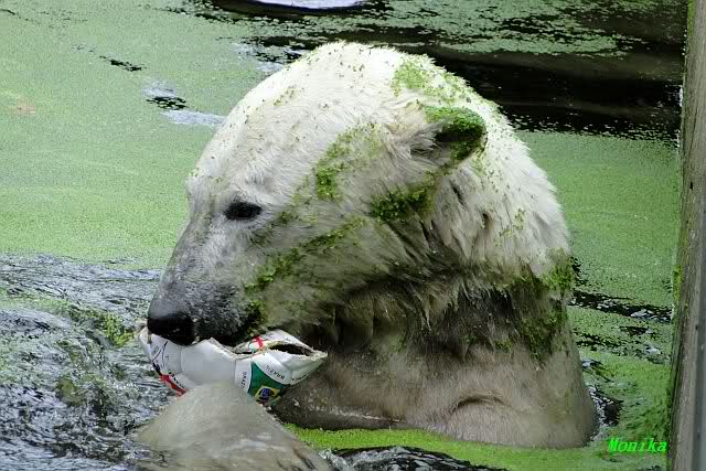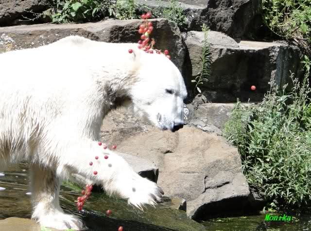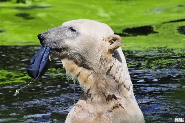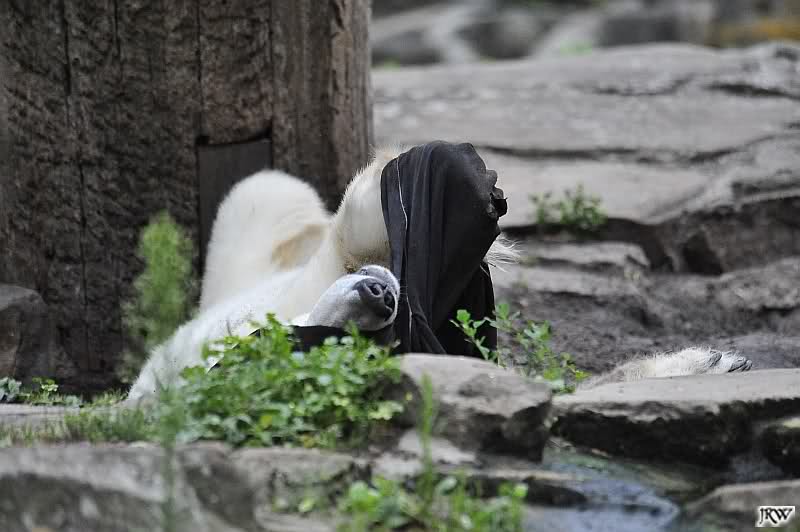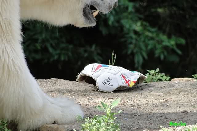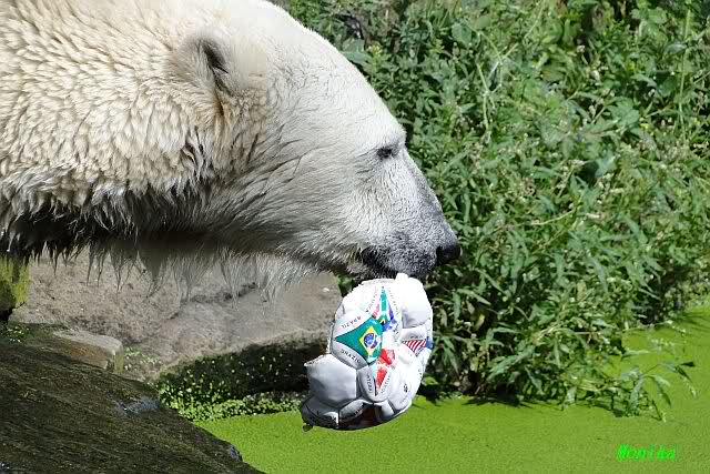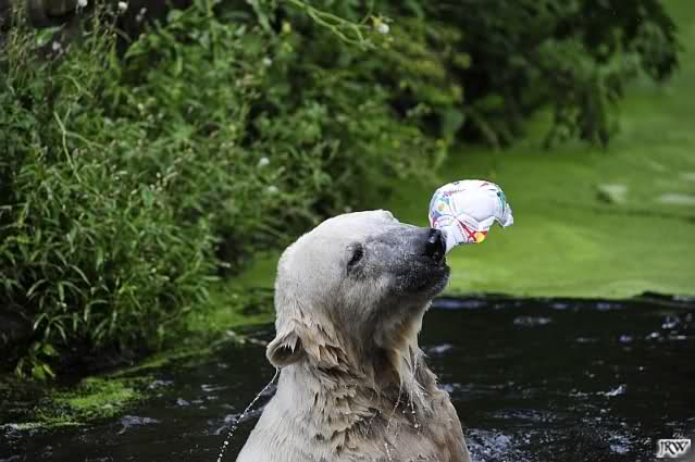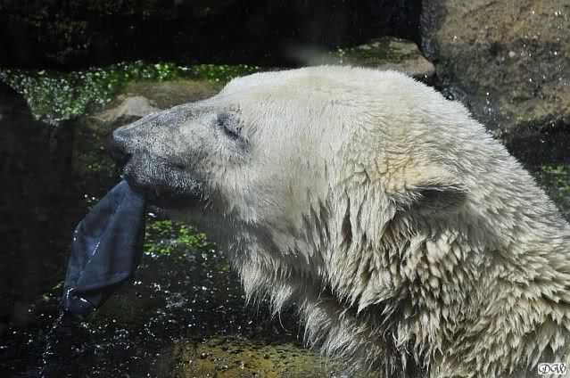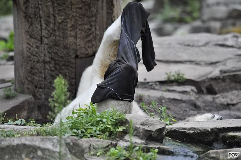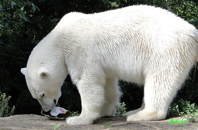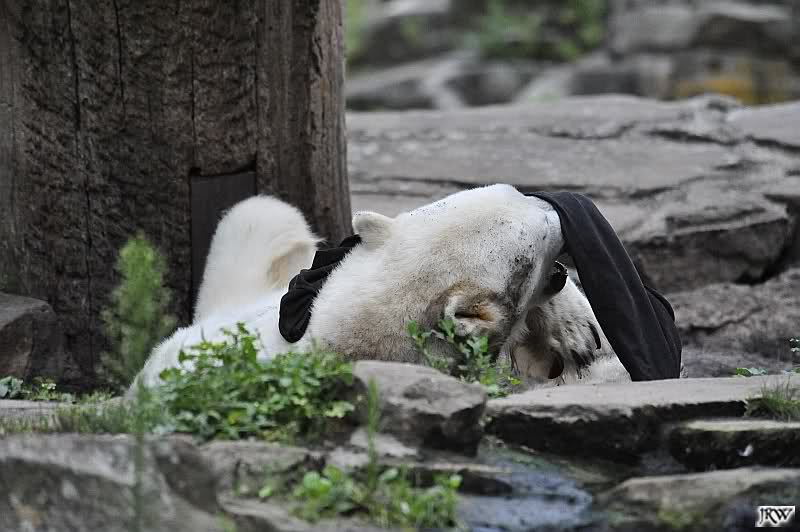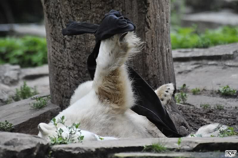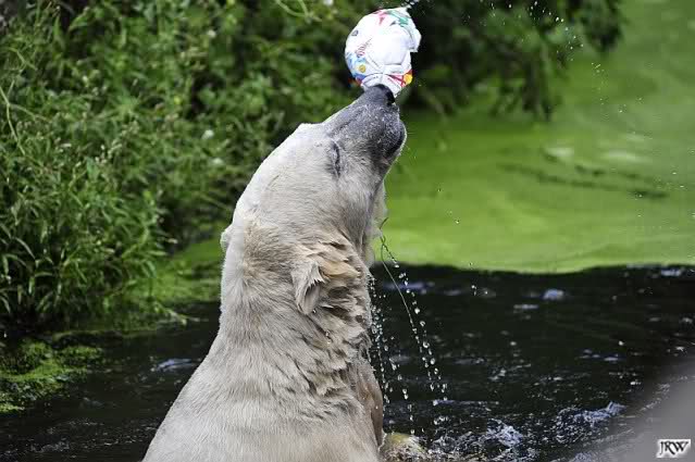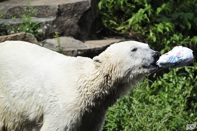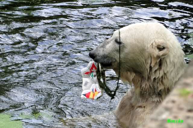 Knut warf den Ball einmal zu den Besuchern, als er zurück flog schnupperte er dran und ließ ihn liegen. Roch wohl nicht gut.