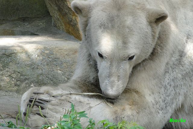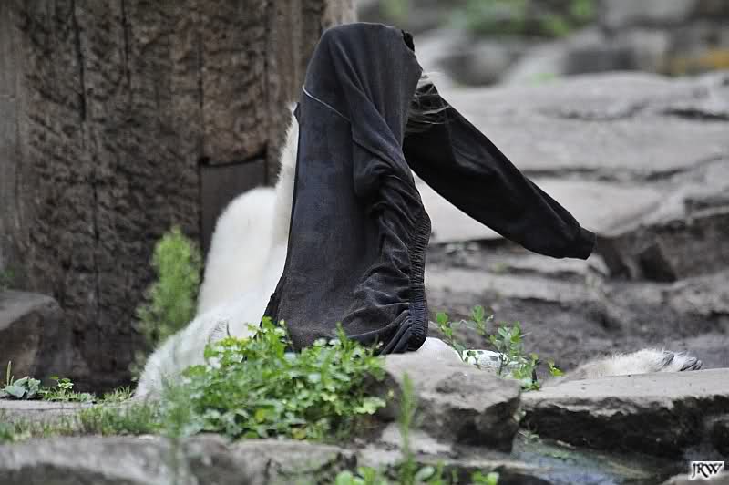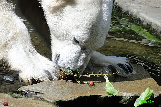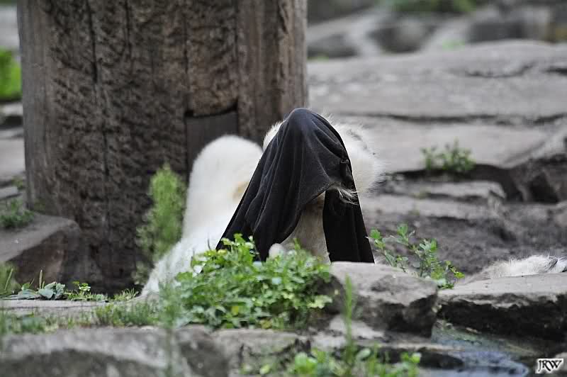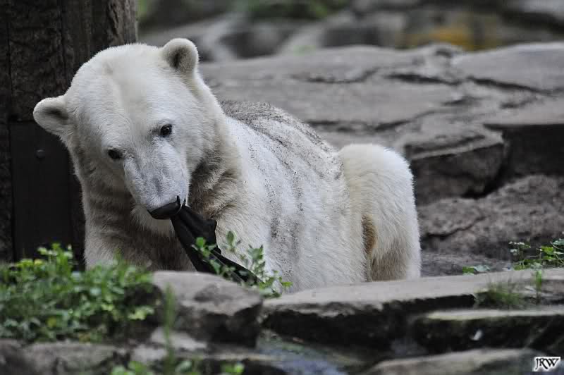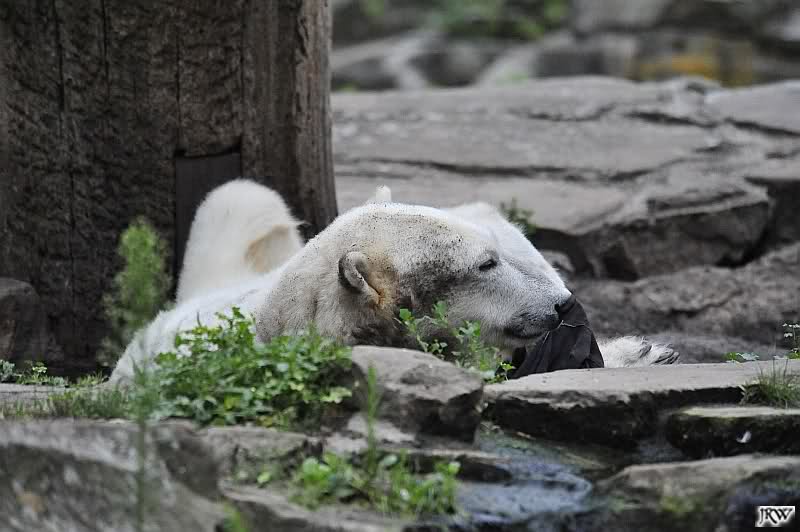 Wenige Tage vor ihrer Abreise bekam Gianna auch heute keine Möhre oder auch nur einen Apfel auf die Anlage geworfen. Knut beeilte sich und fraß restlos alles auf, immer nach oben schauend, ob sie denn etwas schon käme. Als Gianna auf die herauskam, stürzte sie sofort hinunter und suchte alles ab. Später nahm sie seinen Ball und trug ihn nach oben vor den Höhleneingang.