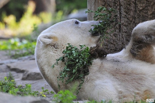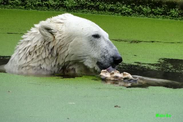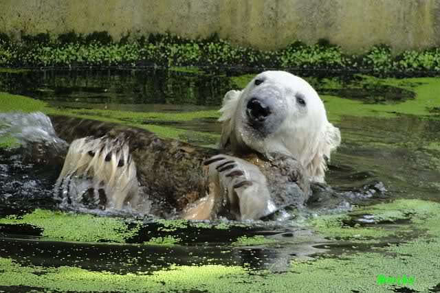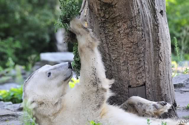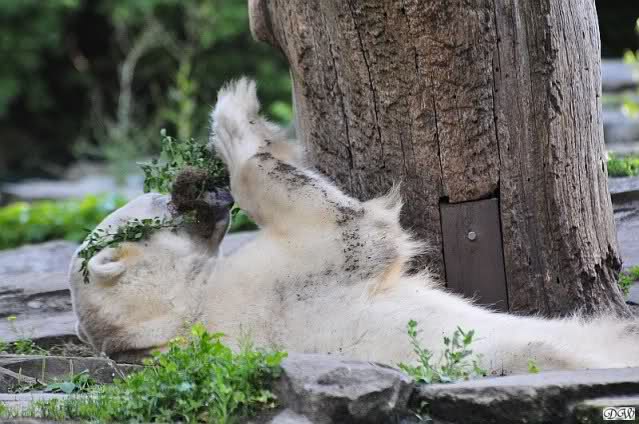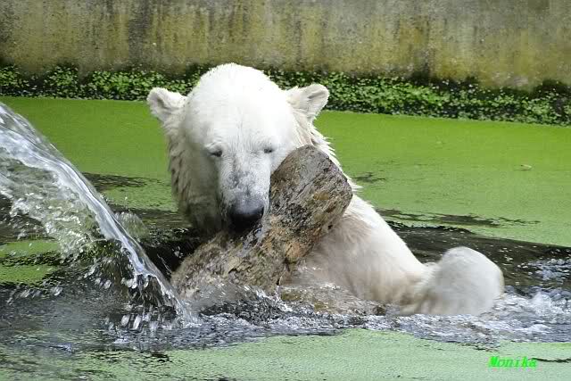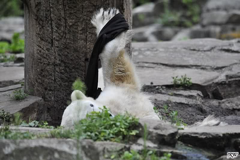Heute Vormittag war Knut in Spiellaune. Er spielte mit den Bällen, Baumstamm und mit dem Brett. Sogar der alte Ochsenschwanz kam wieder zum Vorschein. Das schönste jedoch war, das Knut und Gianna nach langer Zeit ein paar Minuten zusammen im Wasser spielten. Anschließend färbte Knut sich wieder ein.