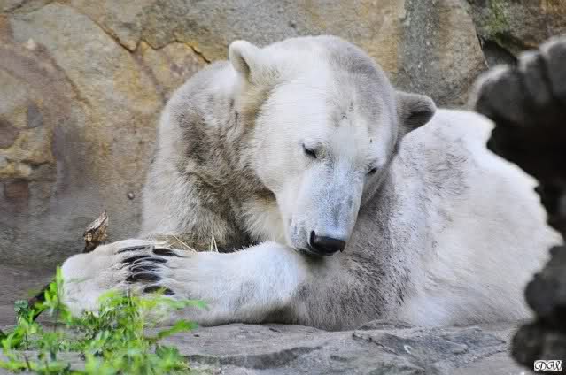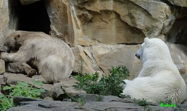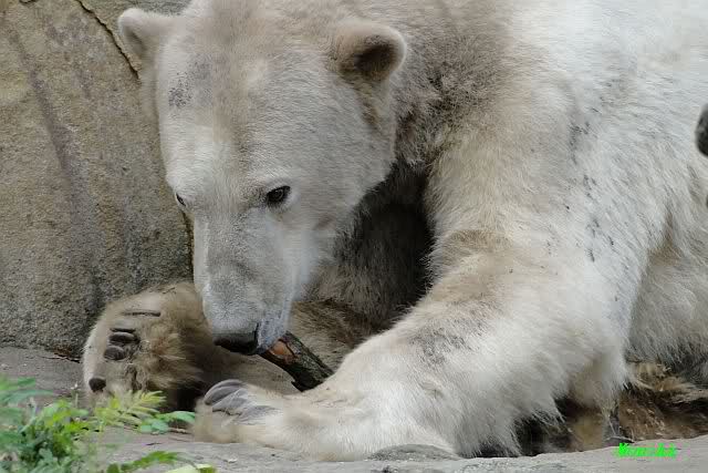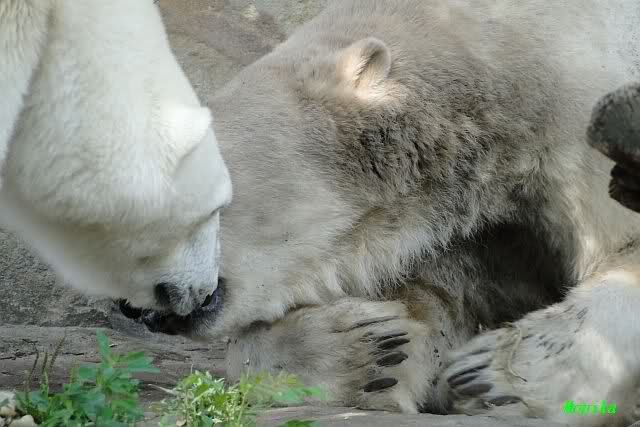 Heute Morgen hat Knut geschlafen und Gianna lief ihre Morgenrunden. Gianna suchte auch heute wieder Knut`s Nähe. Manchmal ließ er es für kurze Zeit zu, zeigte ihr aber durch seine Schnute, dass er doch lieber seine Ruhe haben möchte. Es wurde auch wieder kräftig gebrummt.