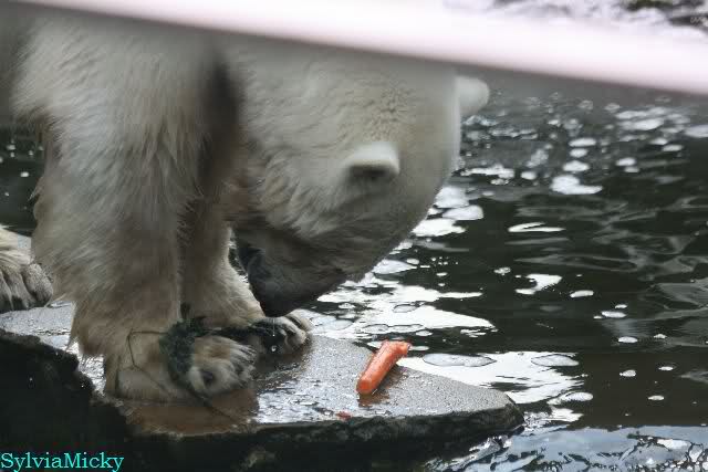 Knut lief gegen Mittag, legte sich aber später hin und Gianna döste. Nach der Fütterung tobten beide im Wasser. Danach gab es wieder einen schwarzen Eisbären.