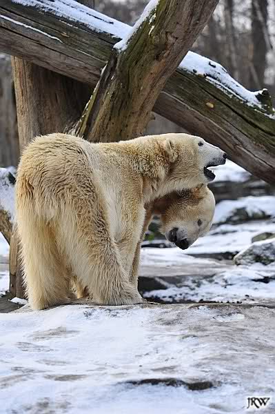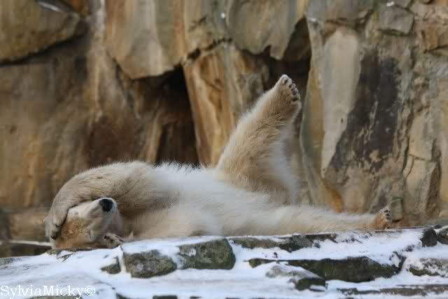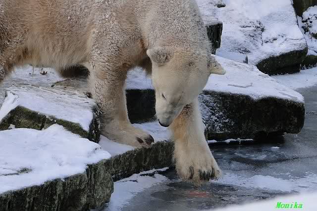 Heute Vormittag wurde wieder geschmust und über den Schnee gerutscht. Gianna holte sich eine Eisscholle aus dem Wasser. Knut wollte ihr nacheifern. Leider erwischte er eine sehr große, die er nicht aus dem Wasser ziehen konnte. Die meisten Tiere waren heute in ihren Stallungen oder Höhlen. Bei einigen die draußen waren sah man, daß ihnen die Kälte nicht gefiel. Nur Gianna und Knut tobten über die Anlage und die Robben schwammen vergnügt im Wasser. Gianna lief zeitweise vor Knut weg, wenn er zu stürmisch wurde. Es war wieder mal eine Freude ihnen zuzusehen. Bei gefühlten -30° bin ich gegen Mittag gegangen.