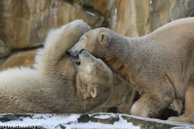 Die Eisbärin Corinna z.B. ist ganz verzückt von dem Öhrchen ihres Antons. Sobald sie zusammen auf einer Anlage sind, geht sie zu ihm und knabbert begeistert an seinem rechten Ohr.