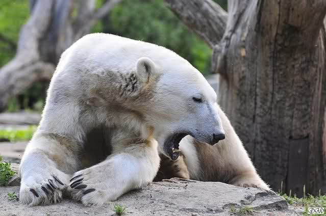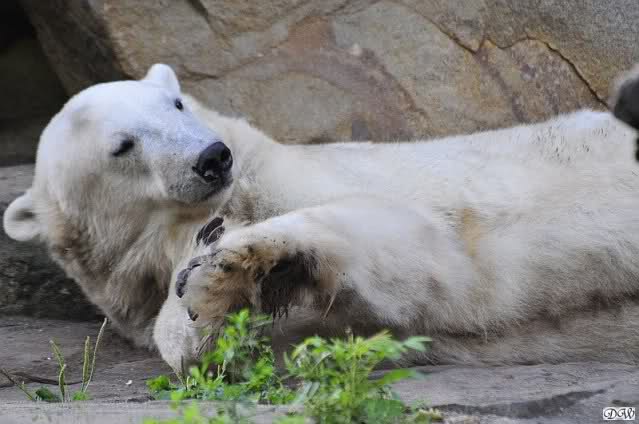 Heute Vormittag war Ruhe bei den Beiden angesagt. Sie lagen auf der Anlage und schliefen. Später legte sich Knut auf die rechte Seite. Kurze Zeit später folgte ihm Gianna. Sie kann ihn nicht liegen sehen. Knut stand langsam auf und zeigte wieder Tapirlippe. Sie legte sich dann wieder unter den Baum und betrachtete Jürgen. Kein Wunder.