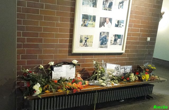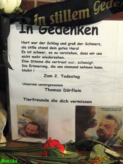 Die Blumen und Gedenkschriften befinden sich noch auf der Bank im Affenhaus. Es kamen sogar noch einige dazu.