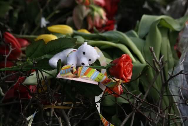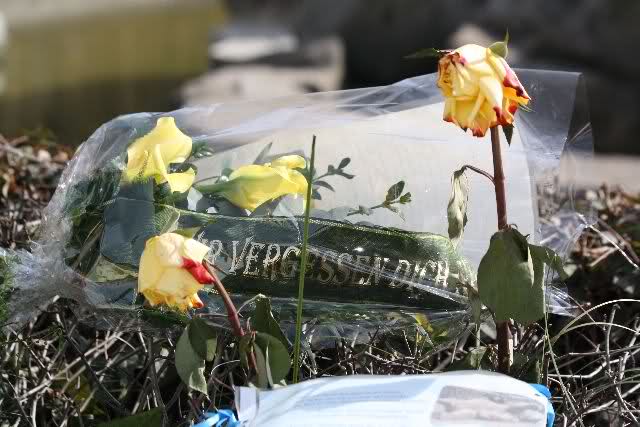 Die Hecke am Eisbärengehege gegenüber von Knuts Platz war voller Blumen. Viele waren mit einem schwarzen Trauerflor versehen. Und viele Briefe gab es! Jeder gab seiner Trauer anders Ausdruck. Manche klagten den Zoo an. Aber die meisten trauerten einfach um Knut und drückten ihreLiebe zu ihm aus. Ich steckte meine Rosen auch in die Hecke, zwischen die vielen Blumen der anderen Besucher. Vor die Glasscheibe stellte ich ein brennendes Grablicht mit Knuts Bild.