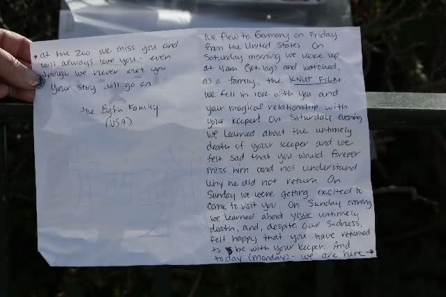 Heute kam ich schon früh am Zoo an, kurz nach neun. Vor dem Zaun, gegenüber der Alpaka-Anlage, hatten in den vergangenen Tagen trauernde Besucher unzählige Blumen abgelegt. Brennende Kerzen leuchteten. Zwischen den Blumen und am Zaun hingen viele Briefe, Abschiedsbriefe für Knut. Viele Briefe waren mit Fotos von Knut und Thomas Dörflein geschmückt. Ich sah auch viele Kinderzeichnungen und Briefe von Kindern. Sie drückten auf besonders anrührende Weise ihren Kummer um Knut aus.