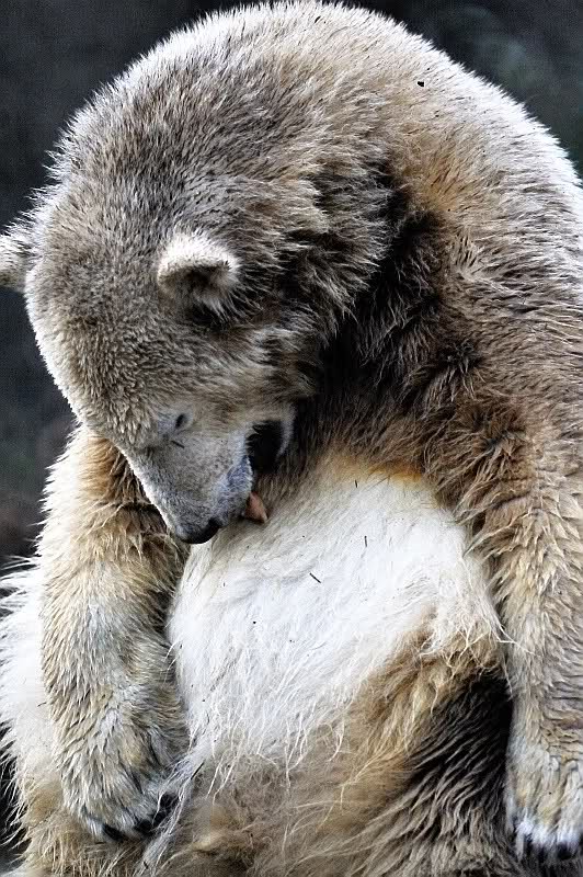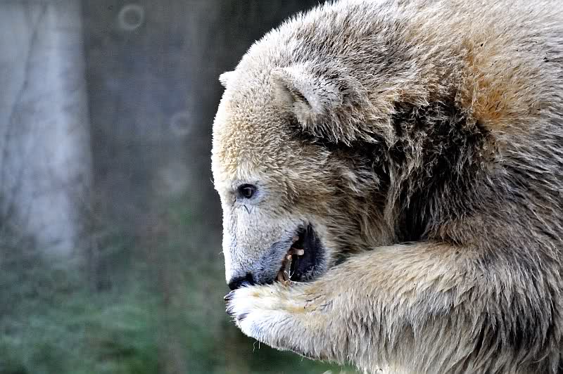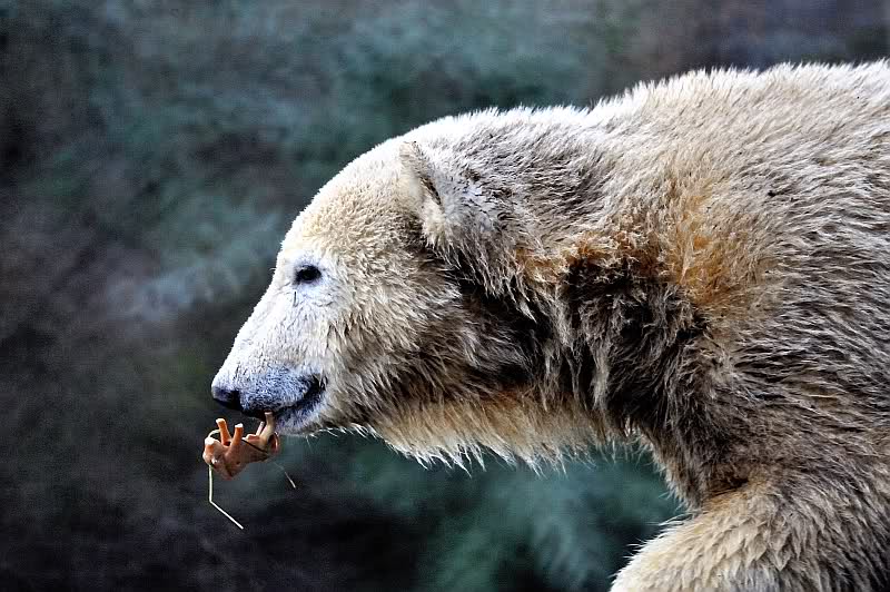Zum Glück wurde ich in dem Moment abgelenkt, denn meine Bekannte, mit der ich mit verabredet hatte, traf am Eisbärengehege ein. Sie hatte ihren kleinen, süßen Neffen mitgebracht. Schon sah der Tag gleich etwas freundlicher aus. Die Fütterung machte heute ein junger Pfleger, der zwar nicht zum Bärenrevier gehört, aber schon öfter dort geholfen hat. Er wurde von einer jungen Frau begleitet, wahrscheinlich eine Auszubildende.
