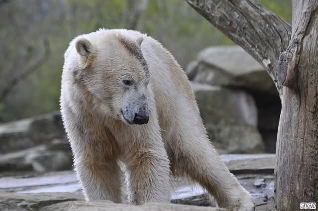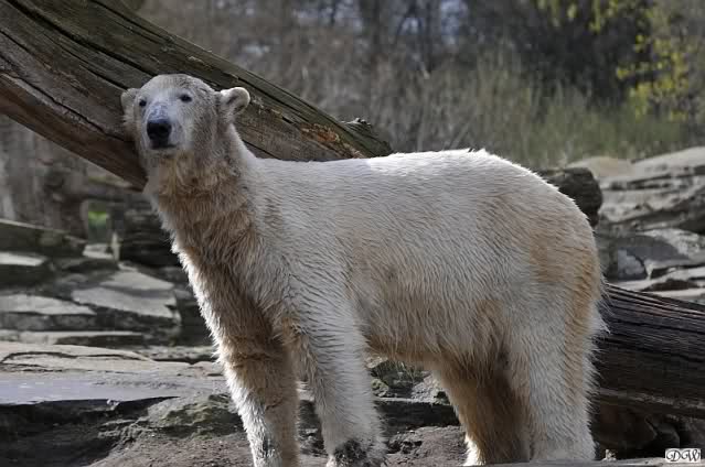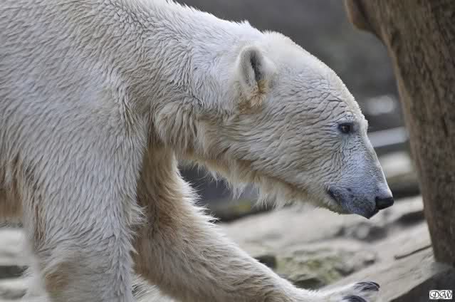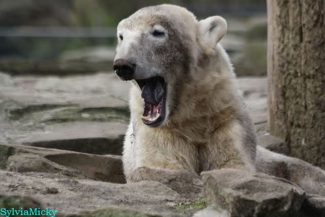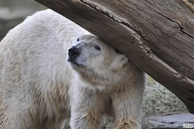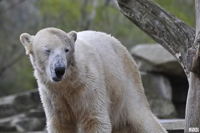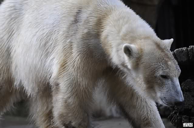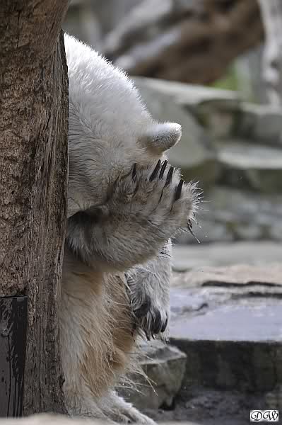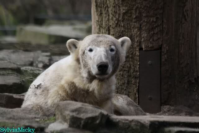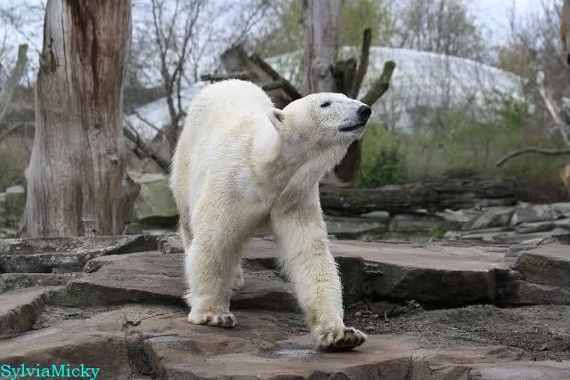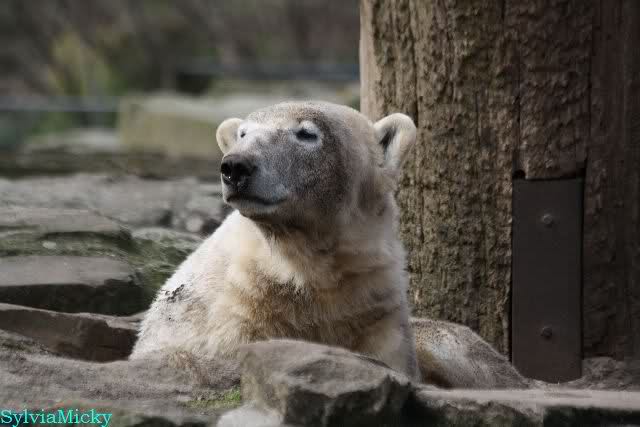 Die beiden machten heute Morgen nicht viel. Vielmehr schlichen sie um den Blechbaum und auch umeinander herum wie Falschgeld. Deshalb ging ich weiter zu den großen Eisbären. Heute war der Zoo vormittags schon ziemlich voll und auch beim Eisbärengehege drängelten sich die Besucher wie zu alten Zeiten. Natürlich wollten wieder viele Leute wissen, wer von den drei Eisbären denn Knut ist. Ich wollte schon um eine Anstellung im Zoo bitten, sozusagen als wandelnde Auskunft.