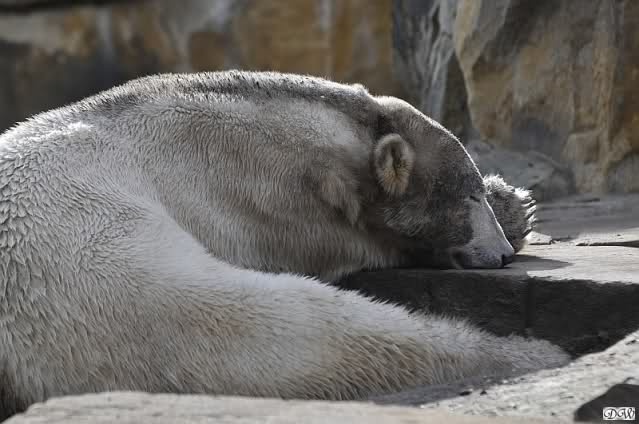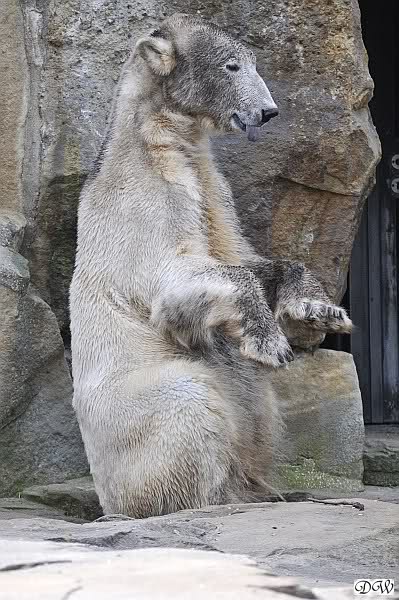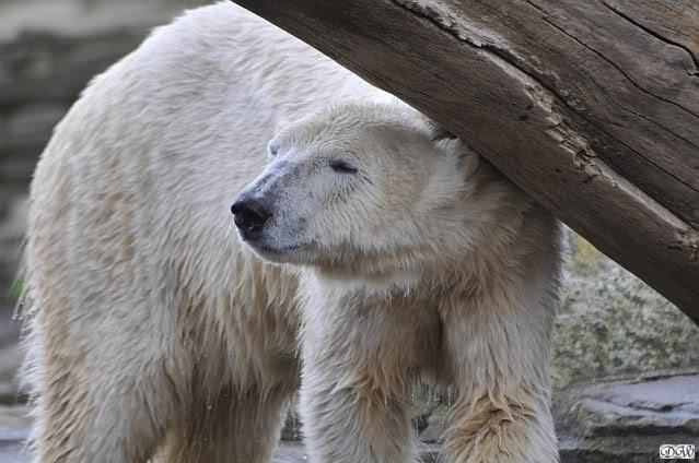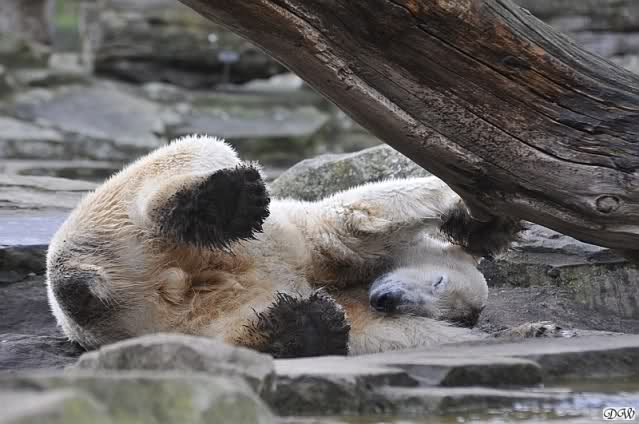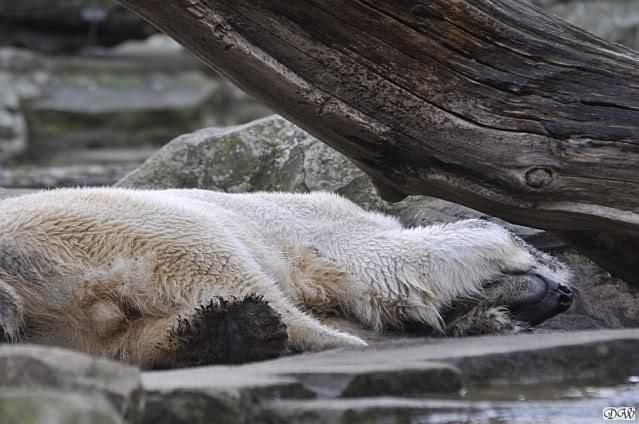 Zunächst gingen wir zu Knut und Gianna. Knut hatte sich in seine Sandkuhle gekuschelt und schlief. Gianna wanderte oben auf der Anlage herum. Nun, dann konnten wir auch eine Zoo-Runde drehen.