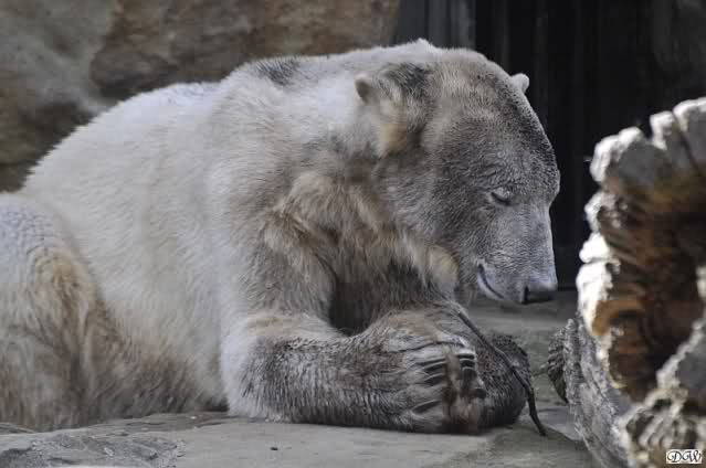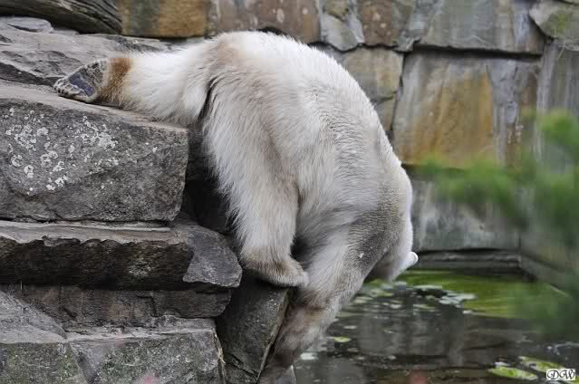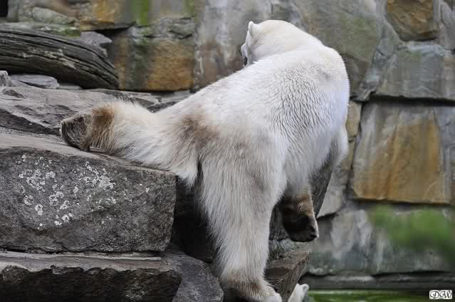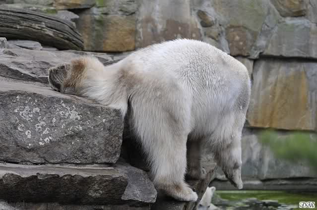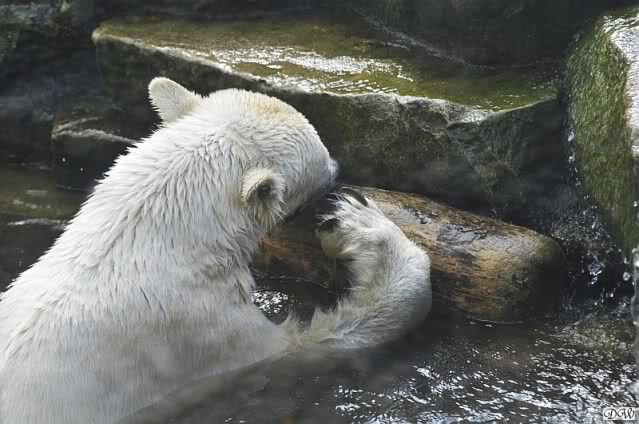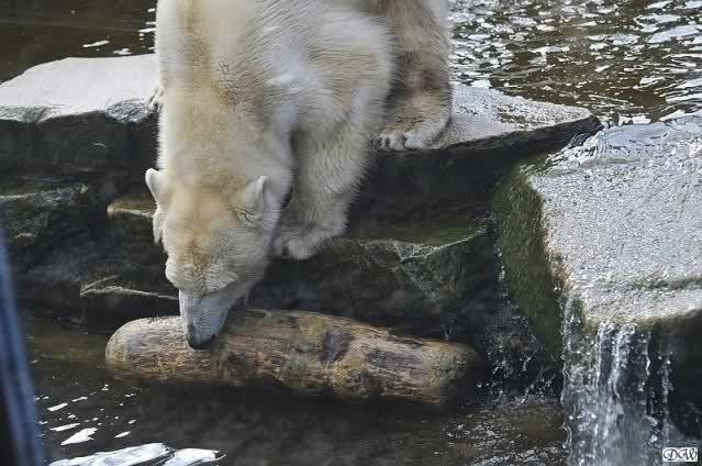 Knut verbrachte am Nachmittag viel Zeit in der hintersten Ecke des Wassergrabens. Er spielte mit kleinen Dingen und war offensichtlich zufrieden mit sich und der Welt. Gianna musste immer wieder nachschauen, was er denn dort tun könnte. Sie kletterte waghalsig den Felsen hinunter und wieder hoch, es kam zu Kontakten zwischen Beiden, die sie aber oft im toten Winkel hatten. Knut beäugte sie danach sehr misstrauisch.