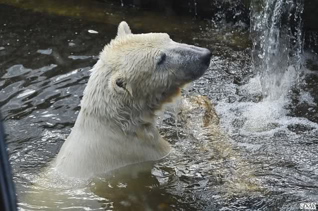 Dann gingen wir zu Knut. Gianna war schon in der Höhle. Nach kurzer Zeit kam Herr Röbke mit dem Futter. Knut bekam heute ein große Portion Futter; ich dachte schon, der Eimer wird überhaupt nicht mehr leer. Vor allem gab es mehrere schöne, große Fische. Herr Röbke machte Knut wieder Bewegung, indem er die wirklich interessanten Dinge wie Fische und Fleisch ins Wasser warf. Knut ließ sich ins Wasser krachen. Er bekam das Futter und wir eine Dusche.